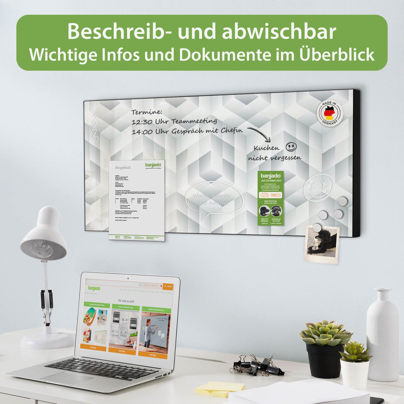 FUNKTION: Die banjado Magnettafel 78x37 cm im Design Motiv Würfel Grau vereint Funktionalität und modernes Wohndesign auf stilvolle Weise. Diese hochwertige Magnetwand aus Metall hilft Ihnen dabei, Notizen, Fotos, Termine, Einkaufslisten oder Rezepte übersichtlich zu organisieren. Als praktisches Memoboard sorgt sie für Struktur im Alltag und setzt gleichzeitig einen dekorativen Akzent an Ihrer Wand. DESIGN: Die Metalltafel besteht aus robustem, lackiertem Stahl und ist mit allen handelsüblichen Magneten nutzbar. Besonders praktisch ist die beschreibbare Oberfläche. Sie können die Magnettafel ganz einfach mit Kreidestiften beschriften und die Inhalte bei Bedarf mit einem feuchten Tuch wieder entfernen. So eignet sich das Memoboard ideal für Wochenpläne, Menüpläne, To Do Listen oder kreative Botschaften. DETAILS: Mit ihrem großzügigen Querformat von 78x37 cm bietet die Magnettafel ausreichend Platz für Ihre Organisation. Das Motiv Motiv Würfel Grau bringt eine warme, natürliche Optik in Küche, Flur, Büro oder Homeoffice und wirkt auch ohne Magnete oder Beschriftung wie ein modernes Wandbild. NUTZEN: Auf der Rückseite befinden sich vorgefertigte Löcher für eine schnelle und unkomplizierte Wandmontage. Jede banjado Magnettafel wird in Deutschland gefertigt und steht für Qualität, Langlebigkeit und liebevolle Verarbeitung. Dieses beschreibbare Memoboard ist die perfekte Kombination aus Metalltafel, Designobjekt und praktischer Magnetwand für Ihren Alltag. BANJADO: Wir sind ein kleines Team aus dem Herzen von Sachsen. Wir fertigen alle Artikel von Hand für Sie an, Sie erhalten keine preiswerte Importware. Auf Wunsch können Sie auch Ihr eigenes Foto auf die Magnettafel aufbringen, schreiben Sie uns an. Herzlichst, Ihr banjado-Team