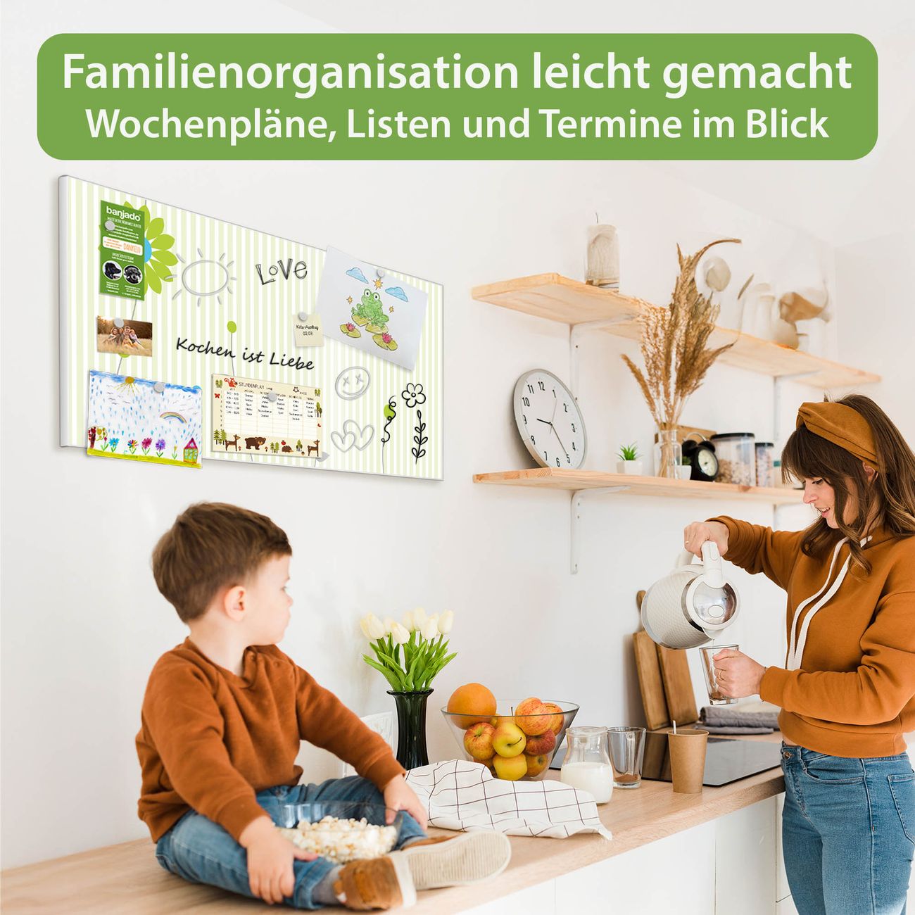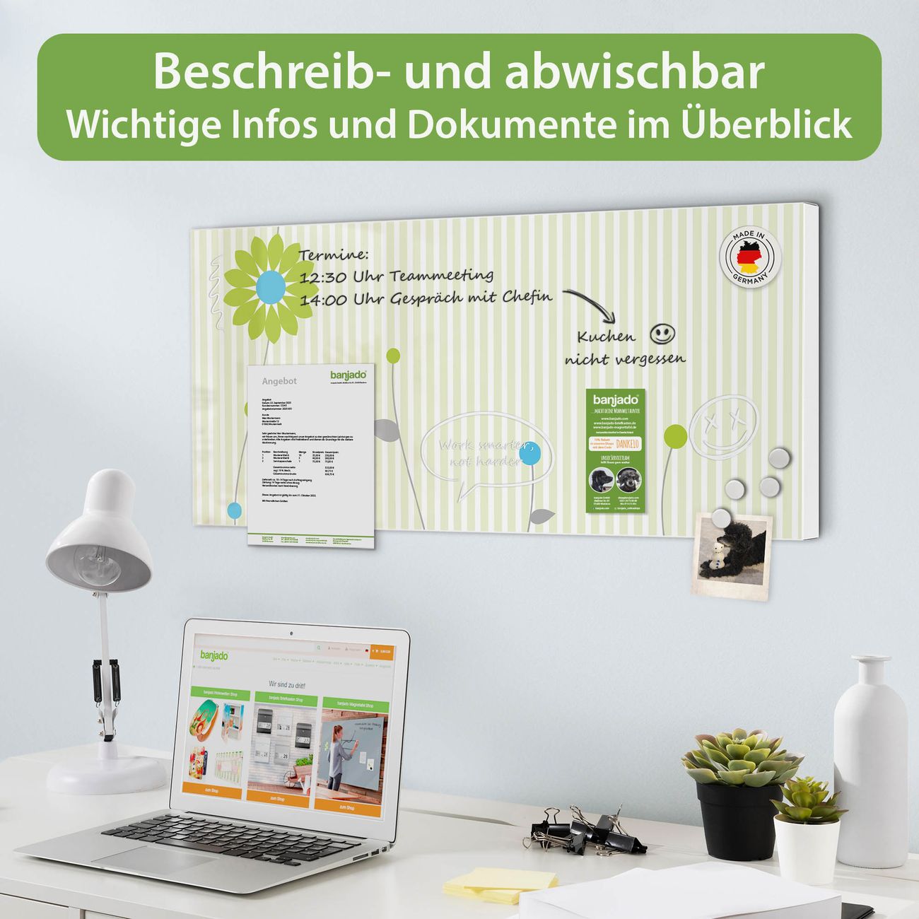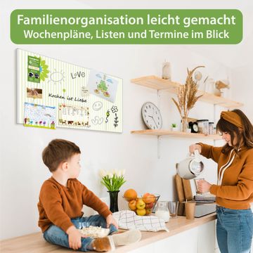 FUNKTION: Die banjado Magnettafel 78x37 cm im Design Motiv Zarte Blumen vereint Funktionalität und modernes Wohndesign auf stilvolle Weise. Diese hochwertige Magnetwand aus Metall hilft Ihnen dabei, Notizen, Fotos, Termine, Einkaufslisten oder Rezepte übersichtlich zu organisieren. Als praktisches Memoboard sorgt sie für Struktur im Alltag und setzt gleichzeitig einen dekorativen Akzent an Ihrer Wand. DESIGN: Die Metalltafel besteht aus robustem, lackiertem Stahl und ist mit allen handelsüblichen Magneten nutzbar. Besonders praktisch ist die beschreibbare Oberfläche. Sie können die Magnettafel ganz einfach mit Kreidestiften beschriften und die Inhalte bei Bedarf mit einem feuchten Tuch wieder entfernen. So eignet sich das Memoboard ideal für Wochenpläne, Menüpläne, To Do Listen oder kreative Botschaften. DETAILS: Mit ihrem großzügigen Querformat von 78x37 cm bietet die Magnettafel ausreichend Platz für Ihre Organisation. Das Motiv Motiv Zarte Blumen bringt eine warme, natürliche Optik in Küche, Flur, Büro oder Homeoffice und wirkt auch ohne Magnete oder Beschriftung wie ein modernes Wandbild. NUTZEN: Auf der Rückseite befinden sich vorgefertigte Löcher für eine schnelle und unkomplizierte Wandmontage. Jede banjado Magnettafel wird in Deutschland gefertigt und steht für Qualität, Langlebigkeit und liebevolle Verarbeitung. Dieses beschreibbare Memoboard ist die perfekte Kombination aus Metalltafel, Designobjekt und praktischer Magnetwand für Ihren Alltag. BANJADO: Wir sind ein kleines Team aus dem Herzen von Sachsen. Wir fertigen alle Artikel von Hand für Sie an, Sie erhalten keine preiswerte Importware. Auf Wunsch können Sie auch Ihr eigenes Foto auf die Magnettafel aufbringen, schreiben Sie uns an. Herzlichst, Ihr banjado-Team