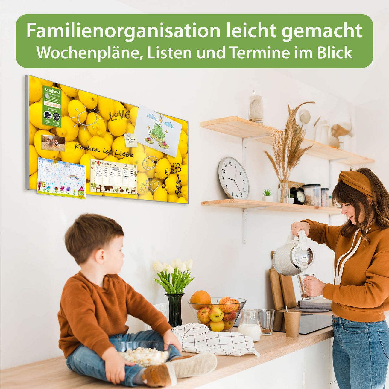 FUNKTION: Die banjado Magnettafel 78x37 cm im Design Motiv Zitronen vereint Funktionalität und modernes Wohndesign auf stilvolle Weise. Diese hochwertige Magnetwand aus Metall hilft Ihnen dabei, Notizen, Fotos, Termine, Einkaufslisten oder Rezepte übersichtlich zu organisieren. Als praktisches Memoboard sorgt sie für Struktur im Alltag und setzt gleichzeitig einen dekorativen Akzent an Ihrer Wand. DESIGN: Die Metalltafel besteht aus robustem, lackiertem Stahl und ist mit allen handelsüblichen Magneten nutzbar. Besonders praktisch ist die beschreibbare Oberfläche. Sie können die Magnettafel ganz einfach mit Kreidestiften beschriften und die Inhalte bei Bedarf mit einem feuchten Tuch wieder entfernen. So eignet sich das Memoboard ideal für Wochenpläne, Menüpläne, To Do Listen oder kreative Botschaften. DETAILS: Mit ihrem großzügigen Querformat von 78x37 cm bietet die Magnettafel ausreichend Platz für Ihre Organisation. Das Motiv Motiv Zitronen bringt eine warme, natürliche Optik in Küche, Flur, Büro oder Homeoffice und wirkt auch ohne Magnete oder Beschriftung wie ein modernes Wandbild. NUTZEN: Auf der Rückseite befinden sich vorgefertigte Löcher für eine schnelle und unkomplizierte Wandmontage. Jede banjado Magnettafel wird in Deutschland gefertigt und steht für Qualität, Langlebigkeit und liebevolle Verarbeitung. Dieses beschreibbare Memoboard ist die perfekte Kombination aus Metalltafel, Designobjekt und praktischer Magnetwand für Ihren Alltag. BANJADO: Wir sind ein kleines Team aus dem Herzen von Sachsen. Wir fertigen alle Artikel von Hand für Sie an, Sie erhalten keine preiswerte Importware. Auf Wunsch können Sie auch Ihr eigenes Foto auf die Magnettafel aufbringen, schreiben Sie uns an. Herzlichst, Ihr banjado-Team