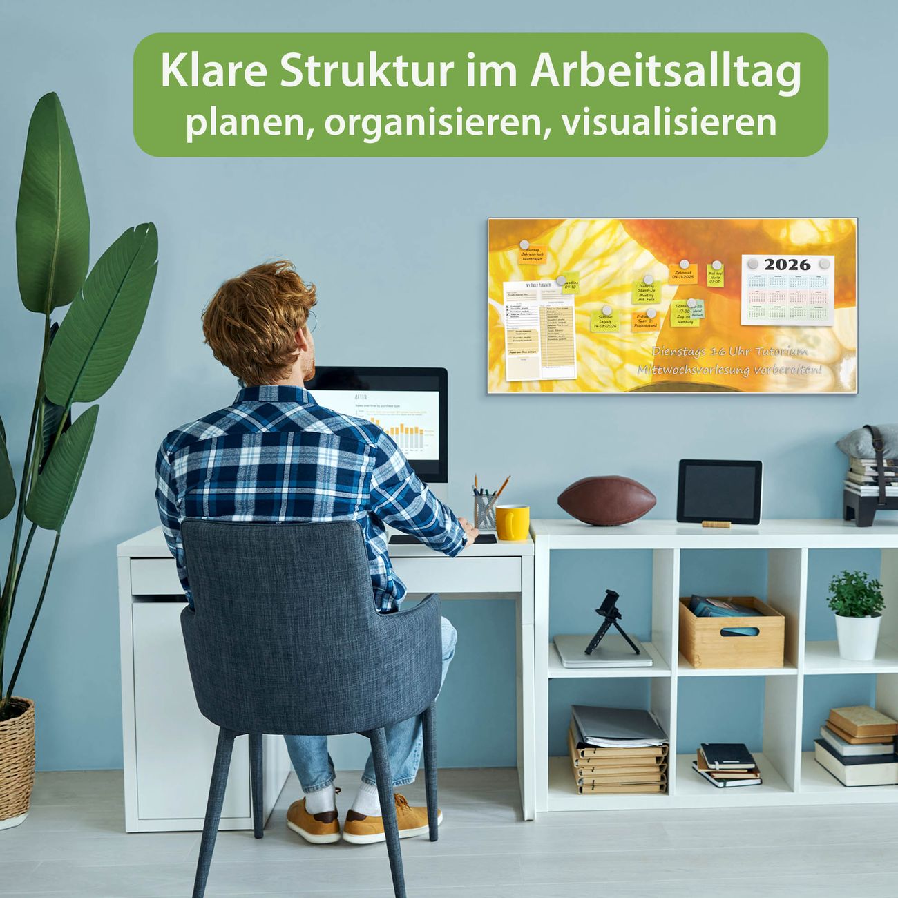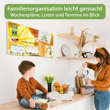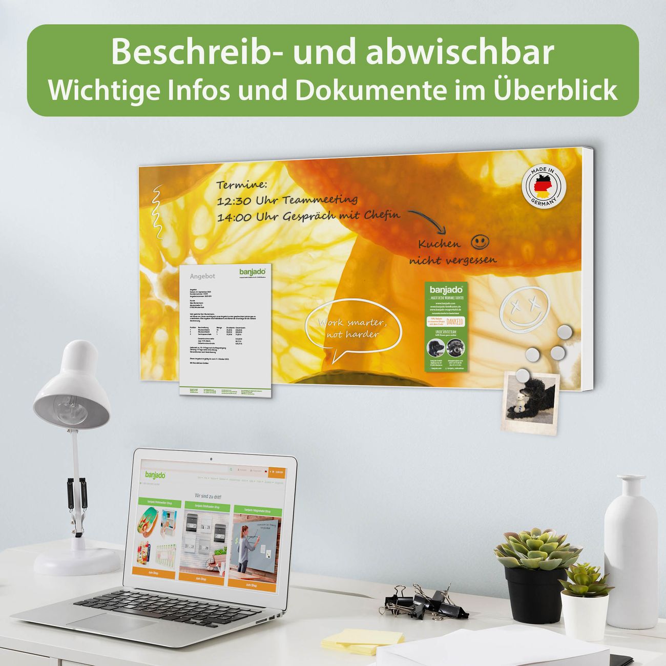 FUNKTION: Die banjado Magnettafel 78x37 cm im Design Motiv Zitrusfrüchte vereint Funktionalität und modernes Wohndesign auf stilvolle Weise. Diese hochwertige Magnetwand aus Metall hilft Ihnen dabei, Notizen, Fotos, Termine, Einkaufslisten oder Rezepte übersichtlich zu organisieren. Als praktisches Memoboard sorgt sie für Struktur im Alltag und setzt gleichzeitig einen dekorativen Akzent an Ihrer Wand. DESIGN: Die Metalltafel besteht aus robustem, lackiertem Stahl und ist mit allen handelsüblichen Magneten nutzbar. Besonders praktisch ist die beschreibbare Oberfläche. Sie können die Magnettafel ganz einfach mit Kreidestiften beschriften und die Inhalte bei Bedarf mit einem feuchten Tuch wieder entfernen. So eignet sich das Memoboard ideal für Wochenpläne, Menüpläne, To Do Listen oder kreative Botschaften. DETAILS: Mit ihrem großzügigen Querformat von 78x37 cm bietet die Magnettafel ausreichend Platz für Ihre Organisation. Das Motiv Motiv Zitrusfrüchte bringt eine warme, natürliche Optik in Küche, Flur, Büro oder Homeoffice und wirkt auch ohne Magnete oder Beschriftung wie ein modernes Wandbild. NUTZEN: Auf der Rückseite befinden sich vorgefertigte Löcher für eine schnelle und unkomplizierte Wandmontage. Jede banjado Magnettafel wird in Deutschland gefertigt und steht für Qualität, Langlebigkeit und liebevolle Verarbeitung. Dieses beschreibbare Memoboard ist die perfekte Kombination aus Metalltafel, Designobjekt und praktischer Magnetwand für Ihren Alltag. BANJADO: Wir sind ein kleines Team aus dem Herzen von Sachsen. Wir fertigen alle Artikel von Hand für Sie an, Sie erhalten keine preiswerte Importware. Auf Wunsch können Sie auch Ihr eigenes Foto auf die Magnettafel aufbringen, schreiben Sie uns an. Herzlichst, Ihr banjado-Team