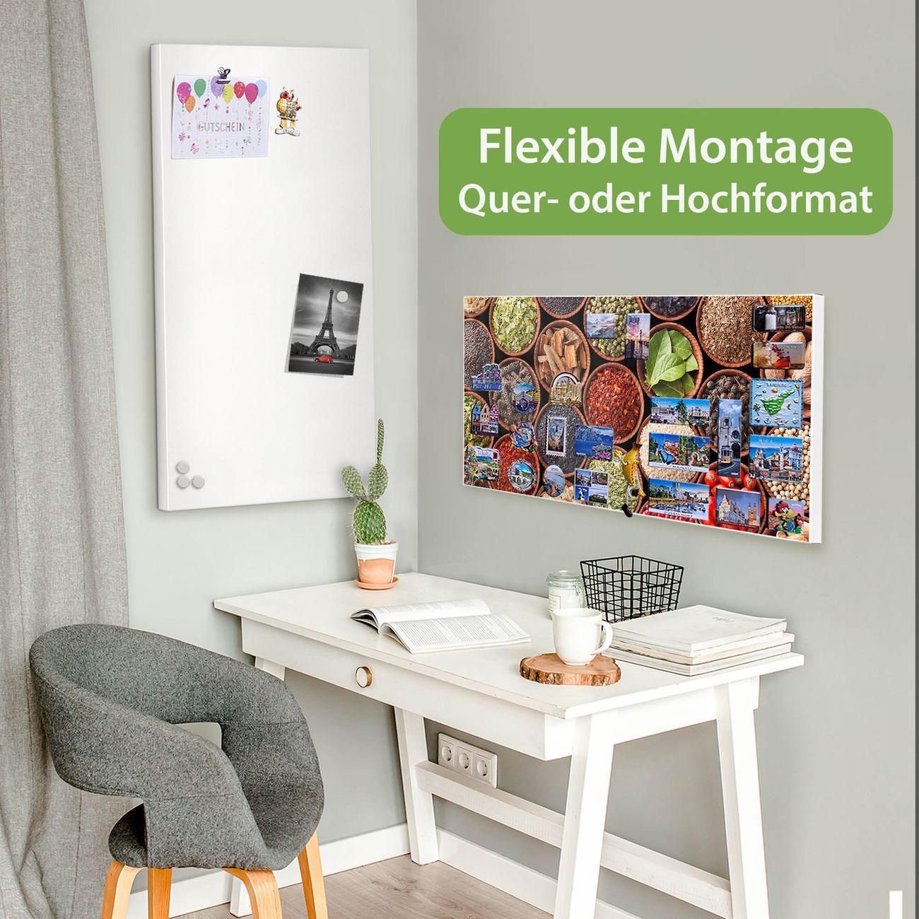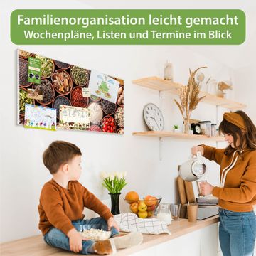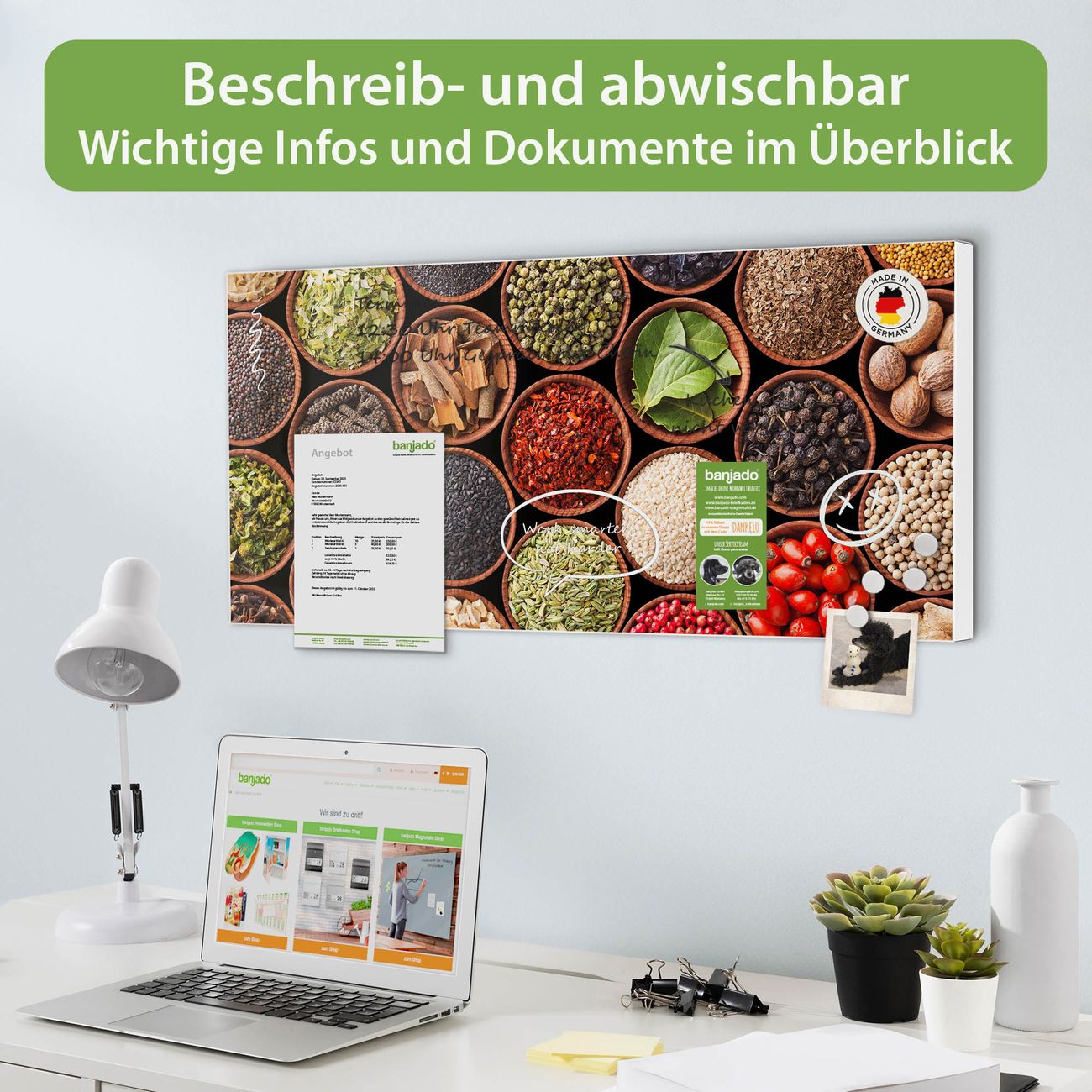 FUNKTION: Die banjado Magnettafel 78x37 cm im Design Motiv Zutaten vereint Funktionalität und modernes Wohndesign auf stilvolle Weise. Diese hochwertige Magnetwand aus Metall hilft Ihnen dabei, Notizen, Fotos, Termine, Einkaufslisten oder Rezepte übersichtlich zu organisieren. Als praktisches Memoboard sorgt sie für Struktur im Alltag und setzt gleichzeitig einen dekorativen Akzent an Ihrer Wand. DESIGN: Die Metalltafel besteht aus robustem, lackiertem Stahl und ist mit allen handelsüblichen Magneten nutzbar. Besonders praktisch ist die beschreibbare Oberfläche. Sie können die Magnettafel ganz einfach mit Kreidestiften beschriften und die Inhalte bei Bedarf mit einem feuchten Tuch wieder entfernen. So eignet sich das Memoboard ideal für Wochenpläne, Menüpläne, To Do Listen oder kreative Botschaften. DETAILS: Mit ihrem großzügigen Querformat von 78x37 cm bietet die Magnettafel ausreichend Platz für Ihre Organisation. Das Motiv Motiv Zutaten bringt eine warme, natürliche Optik in Küche, Flur, Büro oder Homeoffice und wirkt auch ohne Magnete oder Beschriftung wie ein modernes Wandbild. NUTZEN: Auf der Rückseite befinden sich vorgefertigte Löcher für eine schnelle und unkomplizierte Wandmontage. Jede banjado Magnettafel wird in Deutschland gefertigt und steht für Qualität, Langlebigkeit und liebevolle Verarbeitung. Dieses beschreibbare Memoboard ist die perfekte Kombination aus Metalltafel, Designobjekt und praktischer Magnetwand für Ihren Alltag. BANJADO: Wir sind ein kleines Team aus dem Herzen von Sachsen. Wir fertigen alle Artikel von Hand für Sie an, Sie erhalten keine preiswerte Importware. Auf Wunsch können Sie auch Ihr eigenes Foto auf die Magnettafel aufbringen, schreiben Sie uns an. Herzlichst, Ihr banjado-Team