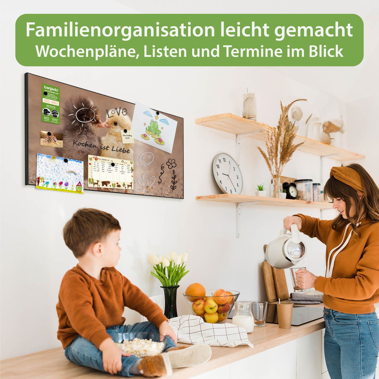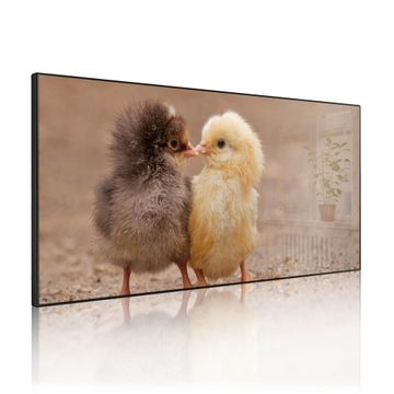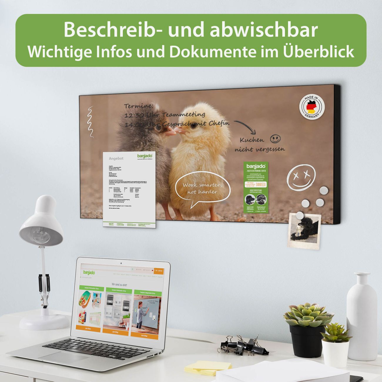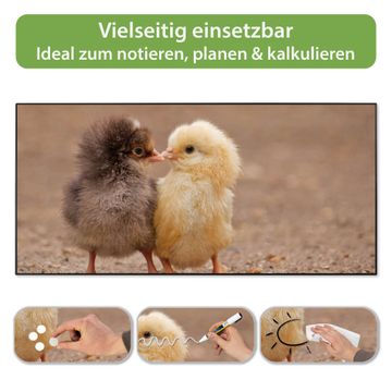 FUNKTION: Die banjado Magnettafel 78x37 cm im Design Motiv Zwei Küken vereint Funktionalität und modernes Wohndesign auf stilvolle Weise. Diese hochwertige Magnetwand aus Metall hilft Ihnen dabei, Notizen, Fotos, Termine, Einkaufslisten oder Rezepte übersichtlich zu organisieren. Als praktisches Memoboard sorgt sie für Struktur im Alltag und setzt gleichzeitig einen dekorativen Akzent an Ihrer Wand. DESIGN: Die Metalltafel besteht aus robustem, lackiertem Stahl und ist mit allen handelsüblichen Magneten nutzbar. Besonders praktisch ist die beschreibbare Oberfläche. Sie können die Magnettafel ganz einfach mit Kreidestiften beschriften und die Inhalte bei Bedarf mit einem feuchten Tuch wieder entfernen. So eignet sich das Memoboard ideal für Wochenpläne, Menüpläne, To Do Listen oder kreative Botschaften. DETAILS: Mit ihrem großzügigen Querformat von 78x37 cm bietet die Magnettafel ausreichend Platz für Ihre Organisation. Das Motiv Motiv Zwei Küken bringt eine warme, natürliche Optik in Küche, Flur, Büro oder Homeoffice und wirkt auch ohne Magnete oder Beschriftung wie ein modernes Wandbild. NUTZEN: Auf der Rückseite befinden sich vorgefertigte Löcher für eine schnelle und unkomplizierte Wandmontage. Jede banjado Magnettafel wird in Deutschland gefertigt und steht für Qualität, Langlebigkeit und liebevolle Verarbeitung. Dieses beschreibbare Memoboard ist die perfekte Kombination aus Metalltafel, Designobjekt und praktischer Magnetwand für Ihren Alltag. BANJADO: Wir sind ein kleines Team aus dem Herzen von Sachsen. Wir fertigen alle Artikel von Hand für Sie an, Sie erhalten keine preiswerte Importware. Auf Wunsch können Sie auch Ihr eigenes Foto auf die Magnettafel aufbringen, schreiben Sie uns an. Herzlichst, Ihr banjado-Team