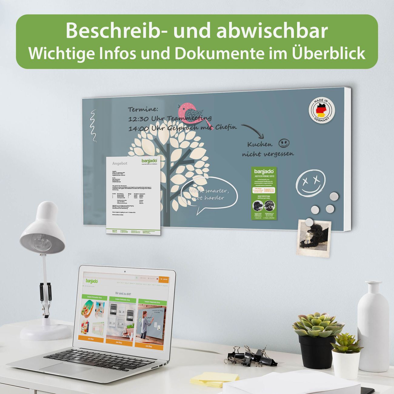 FUNKTION: Die banjado Magnettafel 78x37 cm im Design Motiv Zwei Rosa Vögel vereint Funktionalität und modernes Wohndesign auf stilvolle Weise. Diese hochwertige Magnetwand aus Metall hilft Ihnen dabei, Notizen, Fotos, Termine, Einkaufslisten oder Rezepte übersichtlich zu organisieren. Als praktisches Memoboard sorgt sie für Struktur im Alltag und setzt gleichzeitig einen dekorativen Akzent an Ihrer Wand. DESIGN: Die Metalltafel besteht aus robustem, lackiertem Stahl und ist mit allen handelsüblichen Magneten nutzbar. Besonders praktisch ist die beschreibbare Oberfläche. Sie können die Magnettafel ganz einfach mit Kreidestiften beschriften und die Inhalte bei Bedarf mit einem feuchten Tuch wieder entfernen. So eignet sich das Memoboard ideal für Wochenpläne, Menüpläne, To Do Listen oder kreative Botschaften. DETAILS: Mit ihrem großzügigen Querformat von 78x37 cm bietet die Magnettafel ausreichend Platz für Ihre Organisation. Das Motiv Motiv Zwei Rosa Vögel bringt eine warme, natürliche Optik in Küche, Flur, Büro oder Homeoffice und wirkt auch ohne Magnete oder Beschriftung wie ein modernes Wandbild. NUTZEN: Auf der Rückseite befinden sich vorgefertigte Löcher für eine schnelle und unkomplizierte Wandmontage. Jede banjado Magnettafel wird in Deutschland gefertigt und steht für Qualität, Langlebigkeit und liebevolle Verarbeitung. Dieses beschreibbare Memoboard ist die perfekte Kombination aus Metalltafel, Designobjekt und praktischer Magnetwand für Ihren Alltag. BANJADO: Wir sind ein kleines Team aus dem Herzen von Sachsen. Wir fertigen alle Artikel von Hand für Sie an, Sie erhalten keine preiswerte Importware. Auf Wunsch können Sie auch Ihr eigenes Foto auf die Magnettafel aufbringen, schreiben Sie uns an. Herzlichst, Ihr banjado-Team