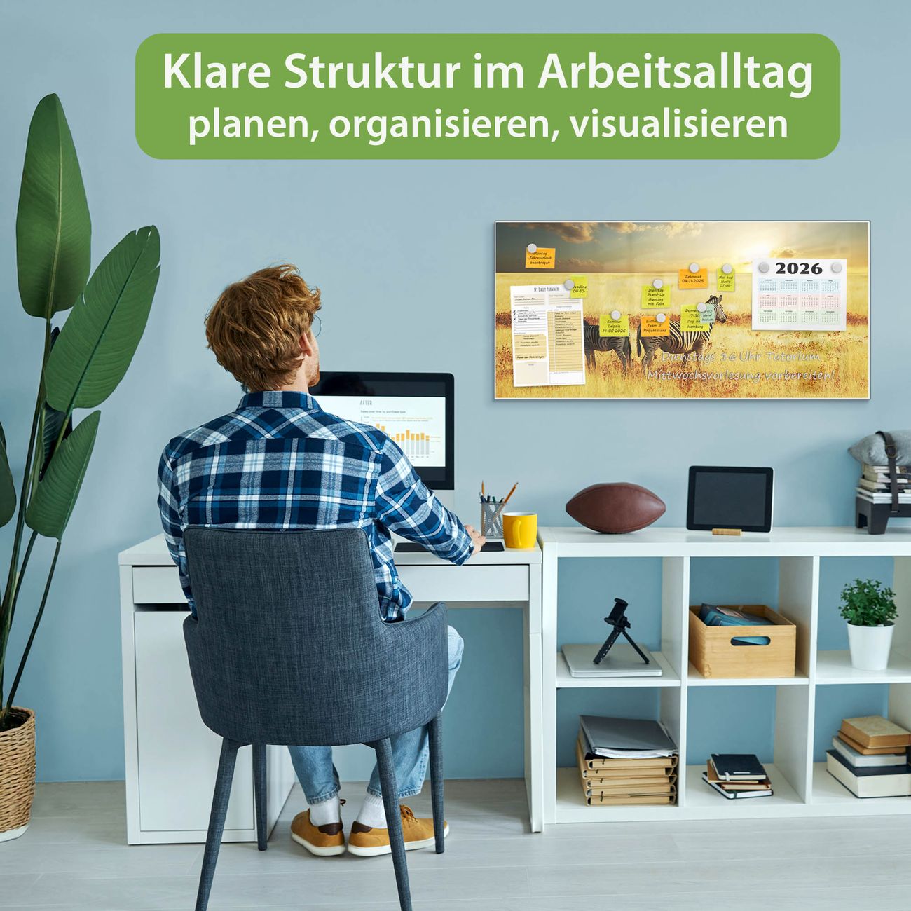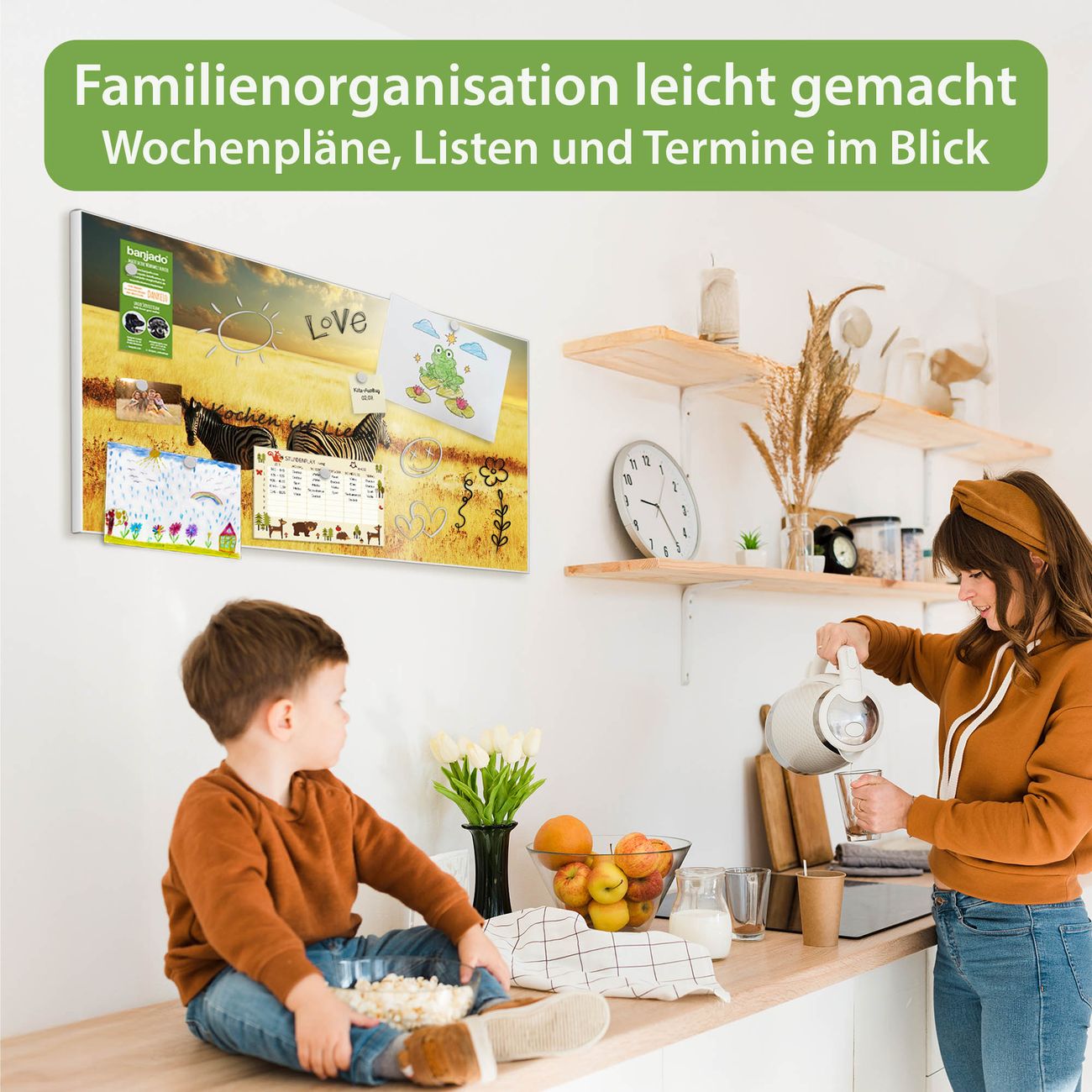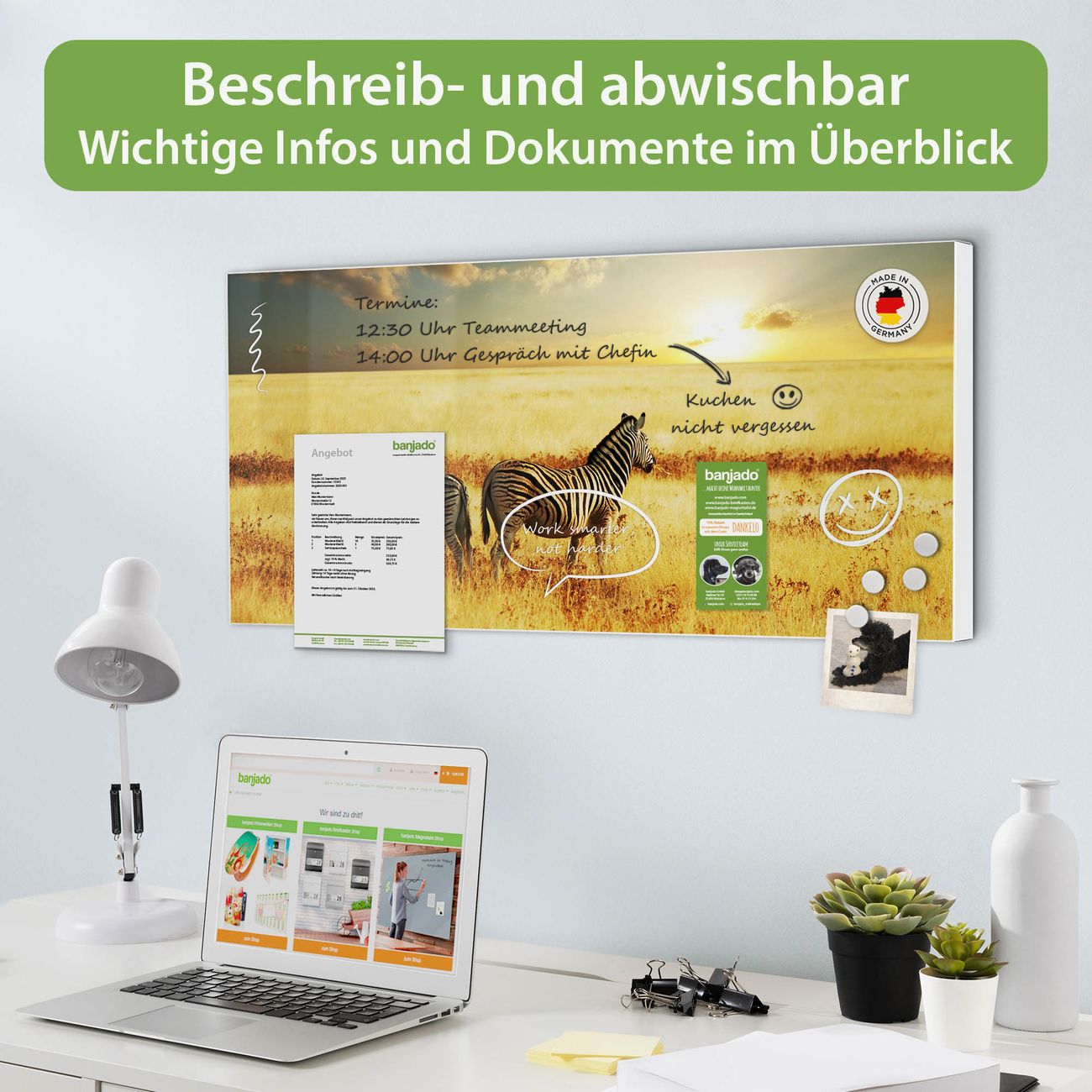FUNKTION: Die banjado Magnettafel 78x37 cm im Design Motiv Zwei Zebras vereint Funktionalität und modernes Wohndesign auf stilvolle Weise. Diese hochwertige Magnetwand aus Metall hilft Ihnen dabei, Notizen, Fotos, Termine, Einkaufslisten oder Rezepte übersichtlich zu organisieren. Als praktisches Memoboard sorgt sie für Struktur im Alltag und setzt gleichzeitig einen dekorativen Akzent an Ihrer Wand. DESIGN: Die Metalltafel besteht aus robustem, lackiertem Stahl und ist mit allen handelsüblichen Magneten nutzbar. Besonders praktisch ist die beschreibbare Oberfläche. Sie können die Magnettafel ganz einfach mit Kreidestiften beschriften und die Inhalte bei Bedarf mit einem feuchten Tuch wieder entfernen. So eignet sich das Memoboard ideal für Wochenpläne, Menüpläne, To Do Listen oder kreative Botschaften. DETAILS: Mit ihrem großzügigen Querformat von 78x37 cm bietet die Magnettafel ausreichend Platz für Ihre Organisation. Das Motiv Motiv Zwei Zebras bringt eine warme, natürliche Optik in Küche, Flur, Büro oder Homeoffice und wirkt auch ohne Magnete oder Beschriftung wie ein modernes Wandbild. NUTZEN: Auf der Rückseite befinden sich vorgefertigte Löcher für eine schnelle und unkomplizierte Wandmontage. Jede banjado Magnettafel wird in Deutschland gefertigt und steht für Qualität, Langlebigkeit und liebevolle Verarbeitung. Dieses beschreibbare Memoboard ist die perfekte Kombination aus Metalltafel, Designobjekt und praktischer Magnetwand für Ihren Alltag. BANJADO: Wir sind ein kleines Team aus dem Herzen von Sachsen. Wir fertigen alle Artikel von Hand für Sie an, Sie erhalten keine preiswerte Importware. Auf Wunsch können Sie auch Ihr eigenes Foto auf die Magnettafel aufbringen, schreiben Sie uns an. Herzlichst, Ihr banjado-Team
