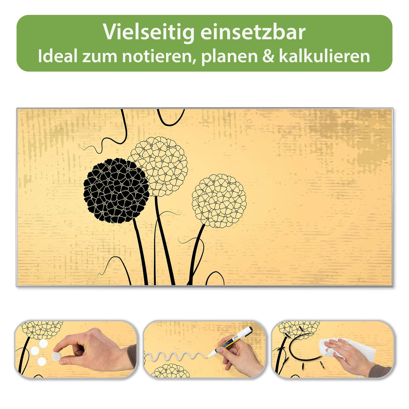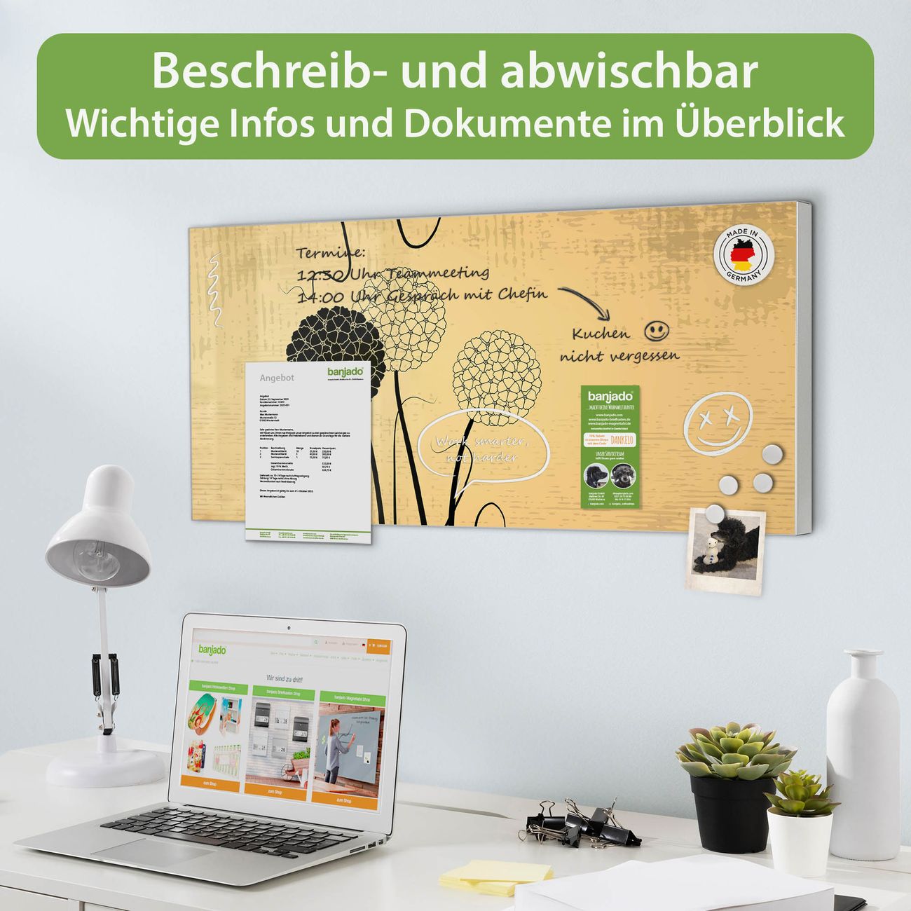 FUNKTION: Die banjado Magnettafel 78x37 cm im Design Motiv Zwiebel Vintage vereint Funktionalität und modernes Wohndesign auf stilvolle Weise. Diese hochwertige Magnetwand aus Metall hilft Ihnen dabei, Notizen, Fotos, Termine, Einkaufslisten oder Rezepte übersichtlich zu organisieren. Als praktisches Memoboard sorgt sie für Struktur im Alltag und setzt gleichzeitig einen dekorativen Akzent an Ihrer Wand. DESIGN: Die Metalltafel besteht aus robustem, lackiertem Stahl und ist mit allen handelsüblichen Magneten nutzbar. Besonders praktisch ist die beschreibbare Oberfläche. Sie können die Magnettafel ganz einfach mit Kreidestiften beschriften und die Inhalte bei Bedarf mit einem feuchten Tuch wieder entfernen. So eignet sich das Memoboard ideal für Wochenpläne, Menüpläne, To Do Listen oder kreative Botschaften. DETAILS: Mit ihrem großzügigen Querformat von 78x37 cm bietet die Magnettafel ausreichend Platz für Ihre Organisation. Das Motiv Motiv Zwiebel Vintage bringt eine warme, natürliche Optik in Küche, Flur, Büro oder Homeoffice und wirkt auch ohne Magnete oder Beschriftung wie ein modernes Wandbild. NUTZEN: Auf der Rückseite befinden sich vorgefertigte Löcher für eine schnelle und unkomplizierte Wandmontage. Jede banjado Magnettafel wird in Deutschland gefertigt und steht für Qualität, Langlebigkeit und liebevolle Verarbeitung. Dieses beschreibbare Memoboard ist die perfekte Kombination aus Metalltafel, Designobjekt und praktischer Magnetwand für Ihren Alltag. BANJADO: Wir sind ein kleines Team aus dem Herzen von Sachsen. Wir fertigen alle Artikel von Hand für Sie an, Sie erhalten keine preiswerte Importware. Auf Wunsch können Sie auch Ihr eigenes Foto auf die Magnettafel aufbringen, schreiben Sie uns an. Herzlichst, Ihr banjado-Team