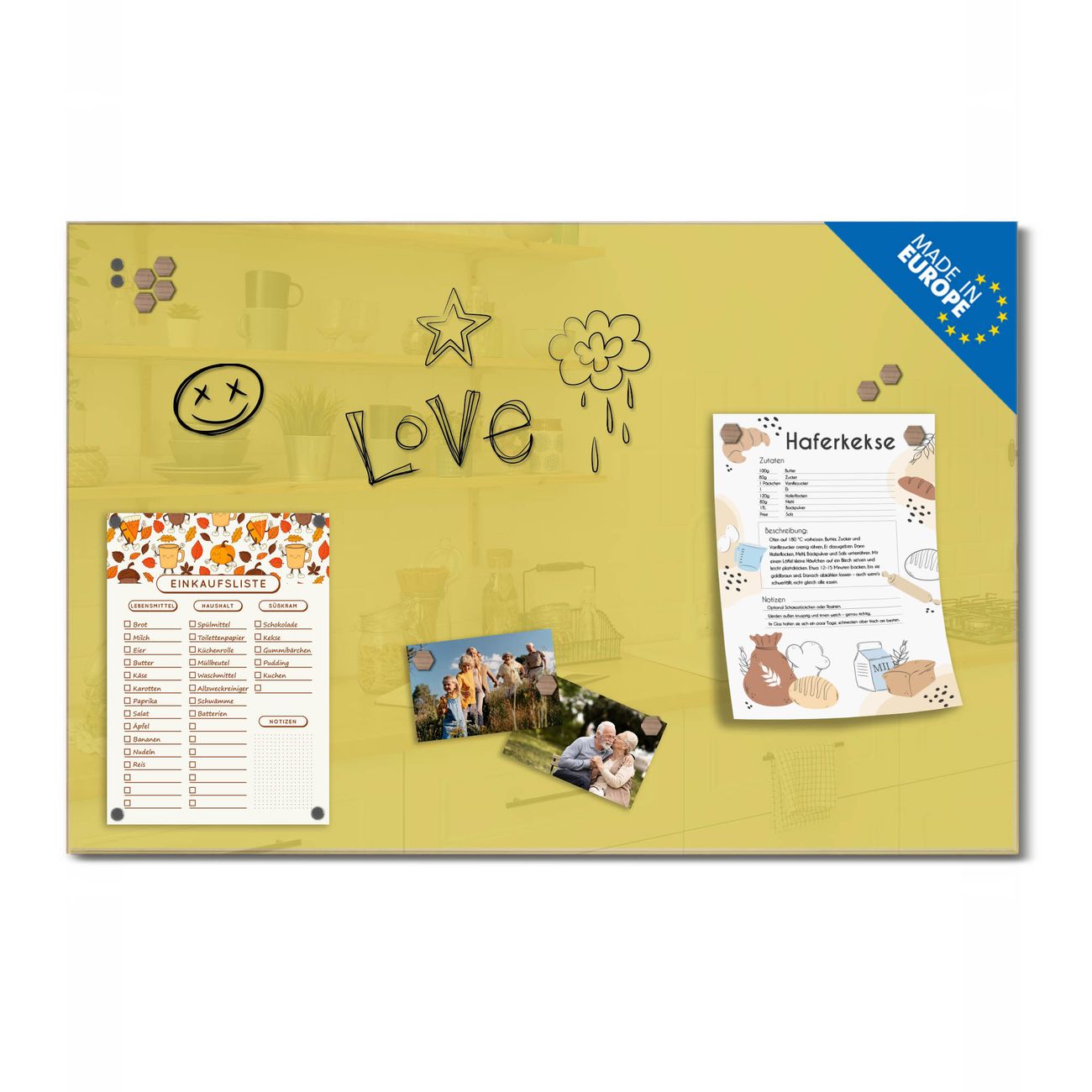 Ein Stück Design, das Ihren Alltag organisiert. Schreiben, heften, inspirieren - alles an einem Ort. Qualität, die man spürt. Montage leicht gemacht. Handwerk mit Herz - veredelt in Sachsen. Einzigartiges Design mit Motiv Farbe Lemon Beschreibbare Glasoberfläche, leicht zu reinigen Starke Magnetkraft durch Stahlrückwand Inklusive 4 Neodym-Magneten Flexible Montageoptionen Handveredelt in Sachsen - Qualität, die bleibt