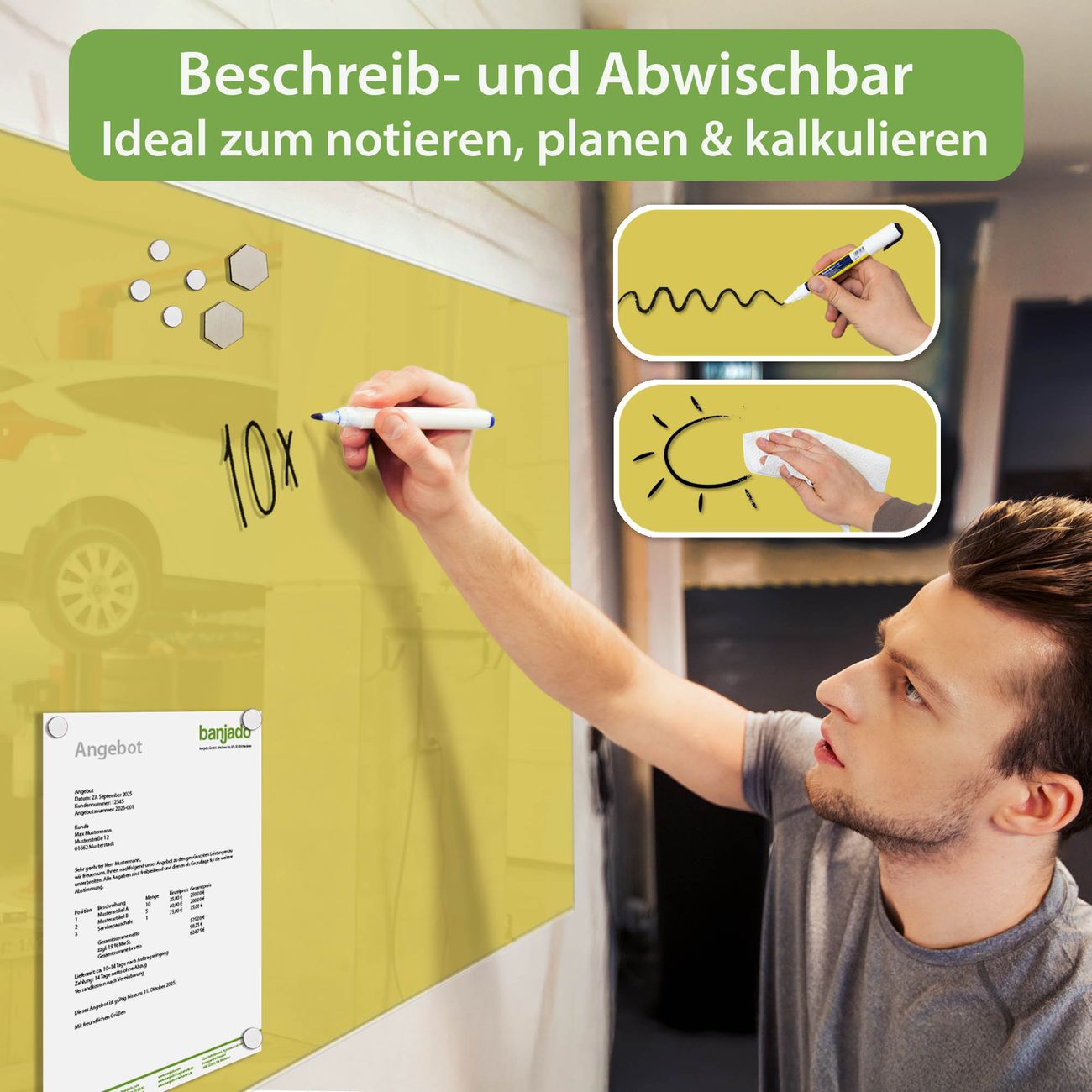 Jede Glas Magnettafel wird in unserer Werkstatt von Hand gefertigt und sorgfältig geprüft. So erhalten Sie ein echtes Qualitätsprodukt, das Funktion und Ästhetik perfekt vereint.?? Warum banjado?