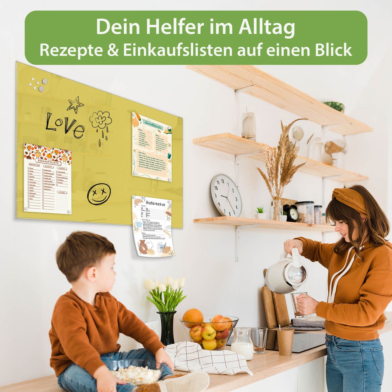 Auf der glatten Glasoberfläche lassen sich Termine, Rezepte oder Notizen ganz einfach mit Kreidestiften festhalten und rückstandslos entfernen. Starke Neodym-Magnete halten Ihre wichtigsten Erinnerungen sicher an Ort und Stelle. So entsteht Ihre ganz persönliche Ideenwand - jeden Tag neu.