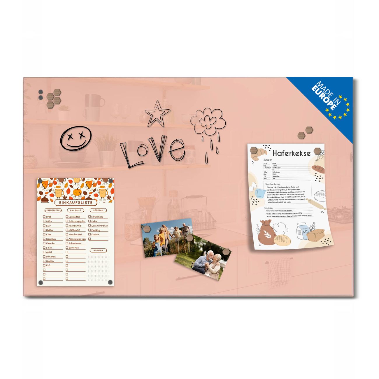 Ein Stück Design, das Ihren Alltag organisiert. Schreiben, heften, inspirieren - alles an einem Ort. Qualität, die man spürt. Montage leicht gemacht. Handwerk mit Herz - veredelt in Sachsen. Einzigartiges Design mit Motiv Farbe Aprikot Beschreibbare Glasoberfläche, leicht zu reinigen Starke Magnetkraft durch Stahlrückwand Inklusive 4 Neodym-Magneten Flexible Montageoptionen Handveredelt in Sachsen - Qualität, die bleibt
