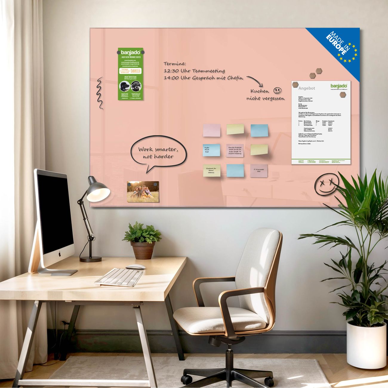 Jede Glas Magnettafel wird in unserer Werkstatt von Hand gefertigt und sorgfältig geprüft. So erhalten Sie ein echtes Qualitätsprodukt, das Funktion und Ästhetik perfekt vereint.?? Warum banjado?