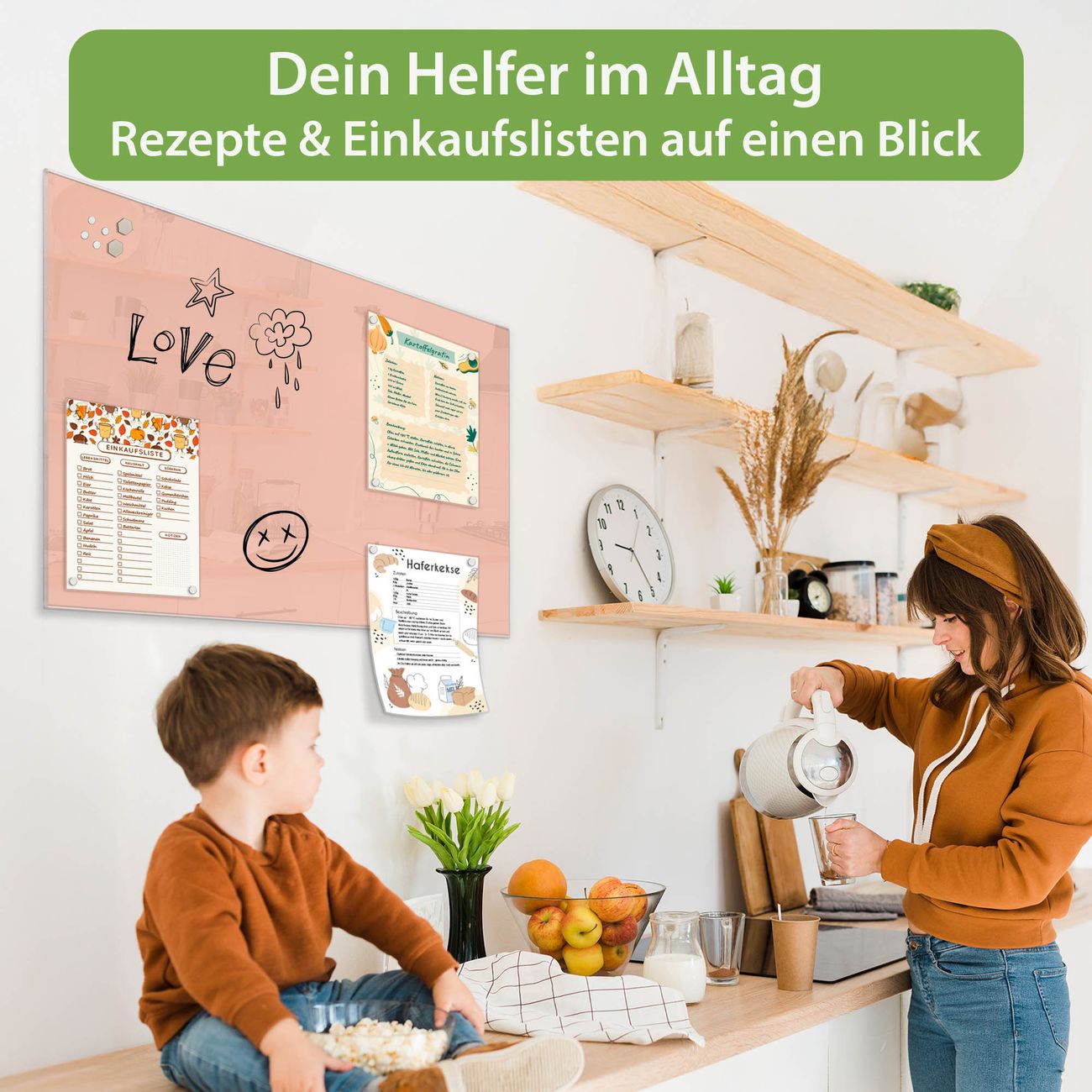 Auf der glatten Glasoberfläche lassen sich Termine, Rezepte oder Notizen ganz einfach mit Kreidestiften festhalten und rückstandslos entfernen. Starke Neodym-Magnete halten Ihre wichtigsten Erinnerungen sicher an Ort und Stelle. So entsteht Ihre ganz persönliche Ideenwand - jeden Tag neu.