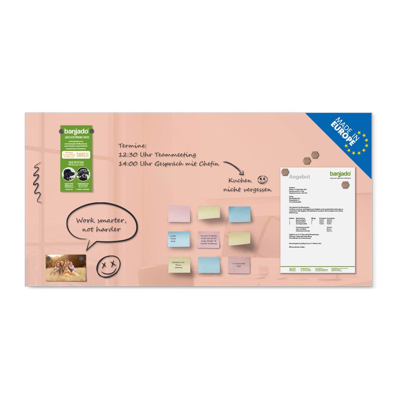 Jede Glas Magnettafel wird in unserer Werkstatt von Hand gefertigt und sorgfältig geprüft. So erhalten Sie ein echtes Qualitätsprodukt, das Funktion und Ästhetik perfekt vereint.?? Warum banjado?