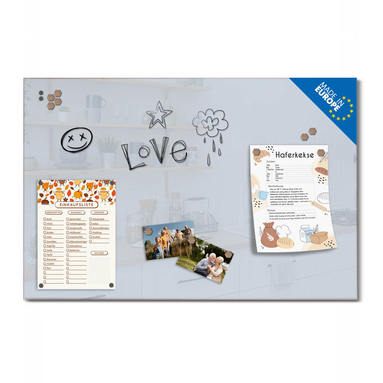 Auf der glatten Glasoberfläche lassen sich Termine, Rezepte oder Notizen ganz einfach mit Kreidestiften festhalten und rückstandslos entfernen. Starke Neodym-Magnete halten Ihre wichtigsten Erinnerungen sicher an Ort und Stelle. So entsteht Ihre ganz persönliche Ideenwand - jeden Tag neu.
