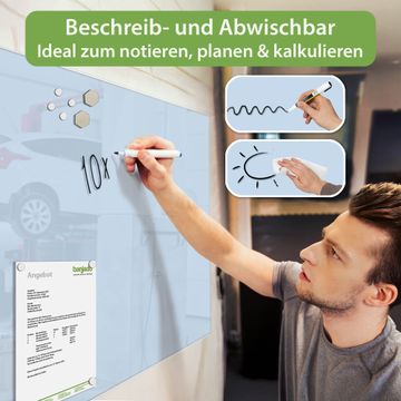 Auf der glatten Glasoberfläche lassen sich Termine, Rezepte oder Notizen ganz einfach mit Kreidestiften festhalten und rückstandslos entfernen. Starke Neodym-Magnete halten Ihre wichtigsten Erinnerungen sicher an Ort und Stelle. So entsteht Ihre ganz persönliche Ideenwand - jeden Tag neu.