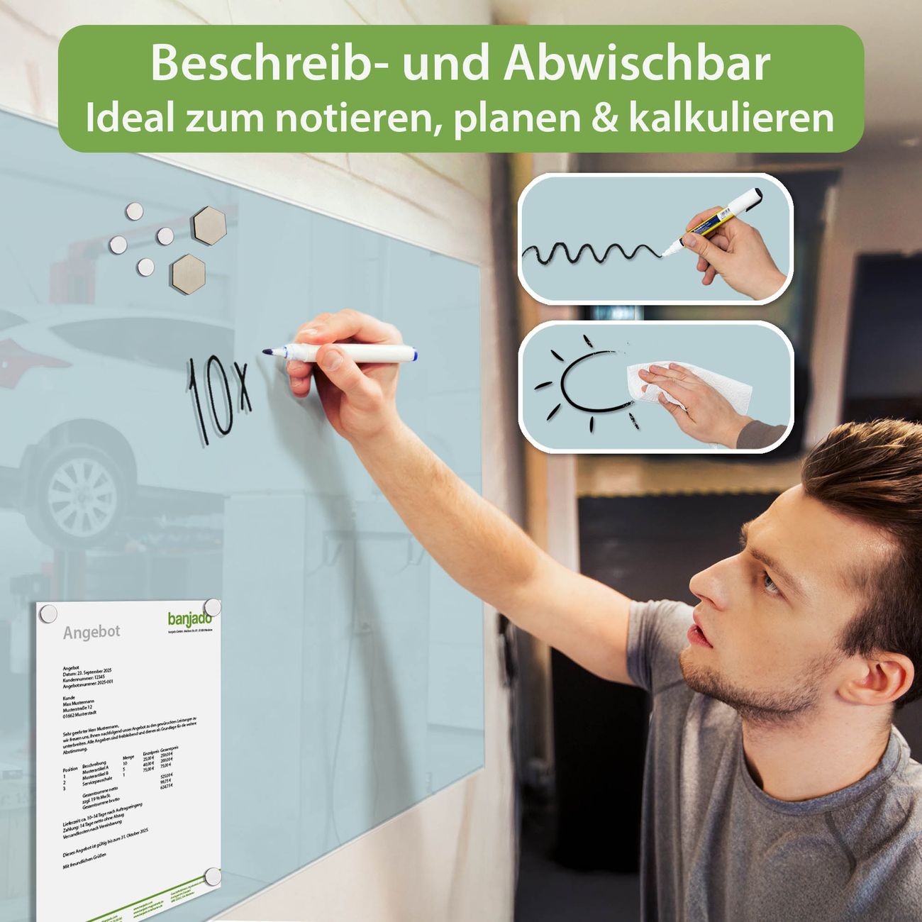 Bitte beachten Sie, dass ausschliessliche spezielle Magnete an der Glastafel haften. Wir empfehlen banjado Neodym Magnete, diese sind durch uns auf Wirksamkeit geprüft.