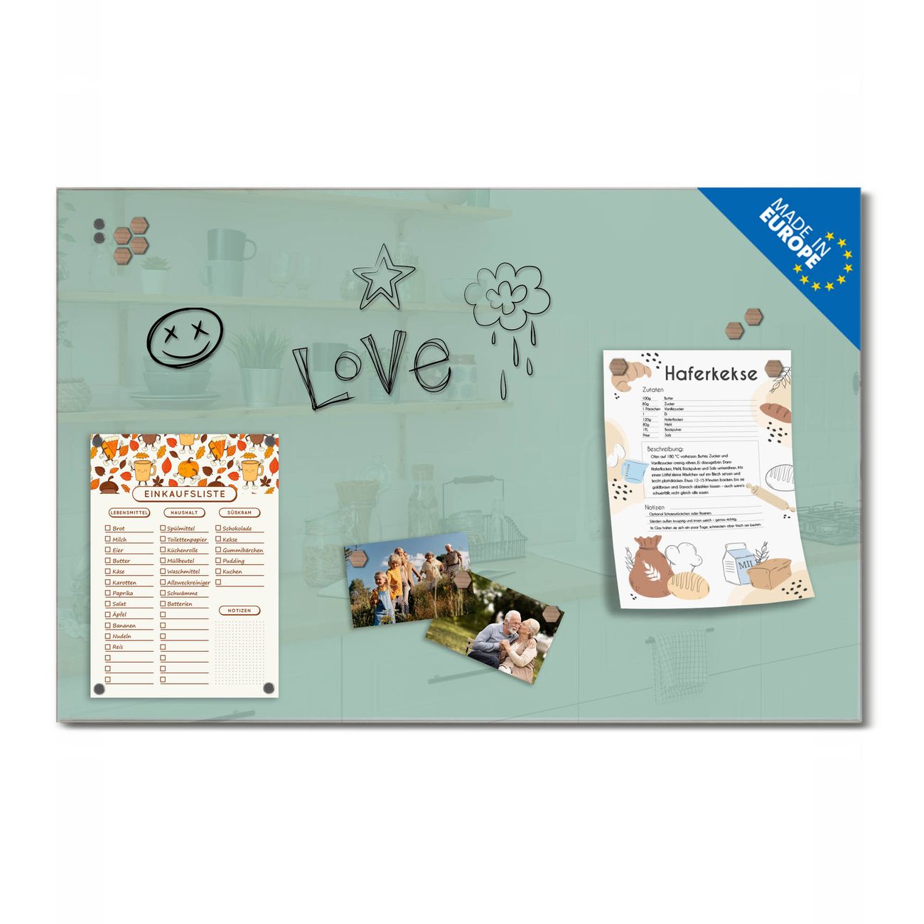 Auf der glatten Glasoberfläche lassen sich Termine, Rezepte oder Notizen ganz einfach mit Kreidestiften festhalten und rückstandslos entfernen. Starke Neodym-Magnete halten Ihre wichtigsten Erinnerungen sicher an Ort und Stelle. So entsteht Ihre ganz persönliche Ideenwand - jeden Tag neu.