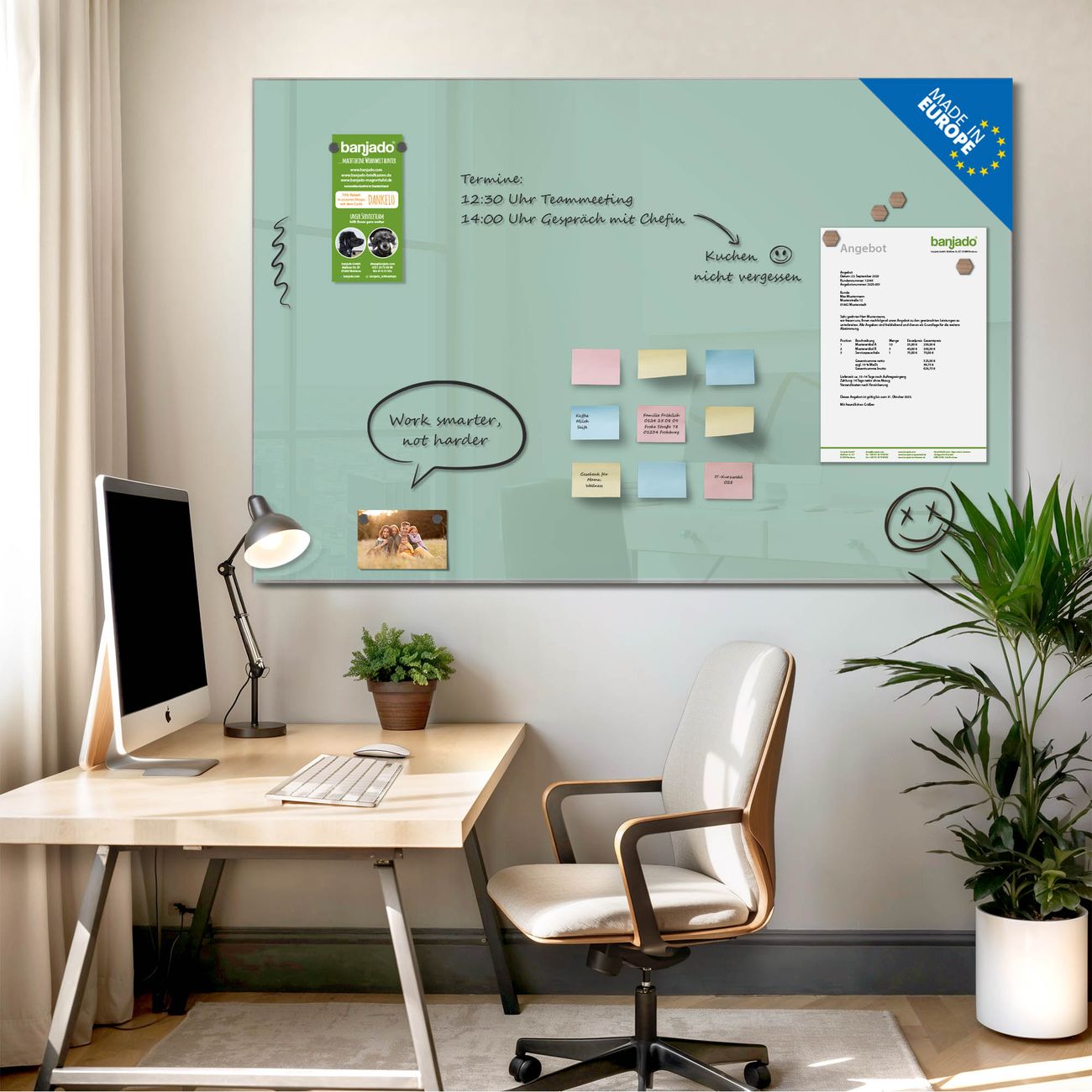 Jede Glas Magnettafel wird in unserer Werkstatt von Hand gefertigt und sorgfältig geprüft. So erhalten Sie ein echtes Qualitätsprodukt, das Funktion und Ästhetik perfekt vereint.?? Warum banjado?