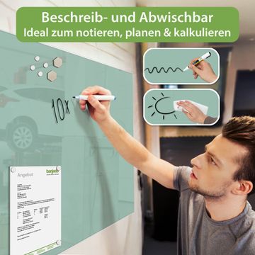 Die banjado Glas Magnettafel mit dem Motiv Farbe Salbei verbindet Funktionalität mit Stil. Sie ersetzt das Zettelchaos durch klare Strukturen und bringt dabei eine warme, natürliche Atmosphäre in Ihr Zuhause. Ob im Büro, in der Küche oder im Eingangsbereich - dieses Design-Board zieht Blicke an und sorgt für Ordnung mit Charakter.