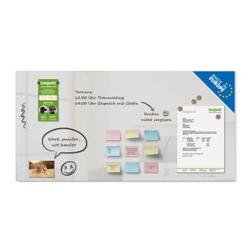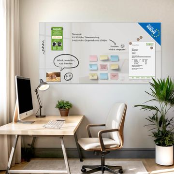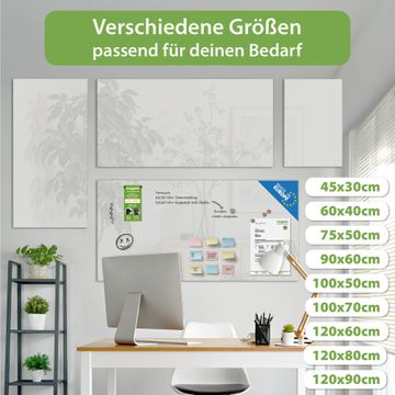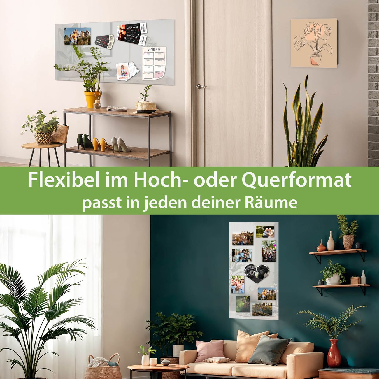 Auf der glatten Glasoberfläche lassen sich Termine, Rezepte oder Notizen ganz einfach mit Kreidestiften festhalten und rückstandslos entfernen. Starke Neodym-Magnete halten Ihre wichtigsten Erinnerungen sicher an Ort und Stelle. So entsteht Ihre ganz persönliche Ideenwand - jeden Tag neu.