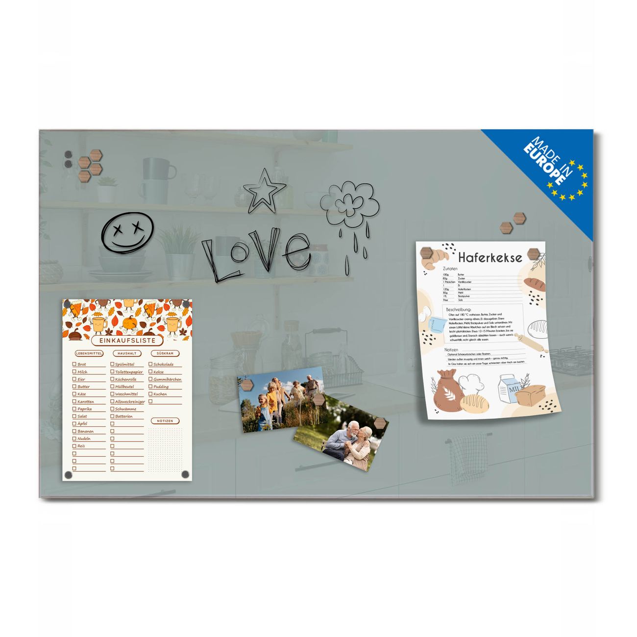 Auf der glatten Glasoberfläche lassen sich Termine, Rezepte oder Notizen ganz einfach mit Kreidestiften festhalten und rückstandslos entfernen. Starke Neodym-Magnete halten Ihre wichtigsten Erinnerungen sicher an Ort und Stelle. So entsteht Ihre ganz persönliche Ideenwand - jeden Tag neu.