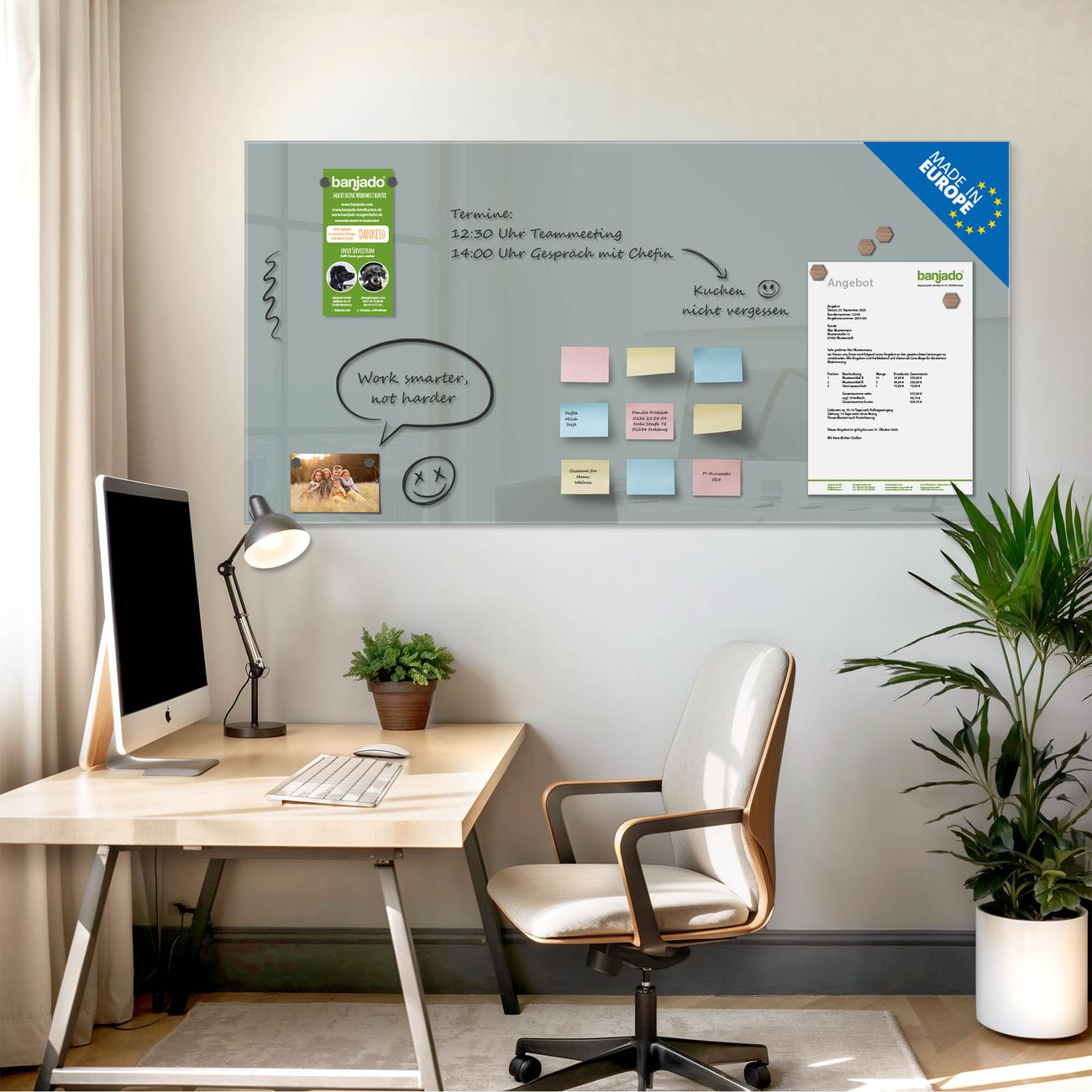 Jede Glas Magnettafel wird in unserer Werkstatt von Hand gefertigt und sorgfältig geprüft. So erhalten Sie ein echtes Qualitätsprodukt, das Funktion und Ästhetik perfekt vereint.?? Warum banjado?