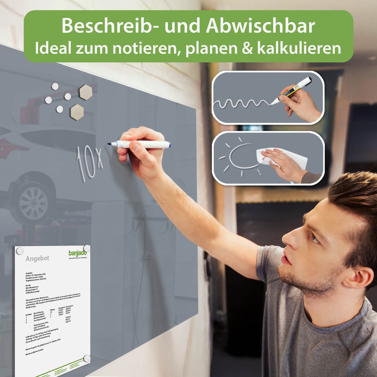 Bitte beachten Sie, dass ausschliessliche spezielle Magnete an der Glastafel haften. Wir empfehlen banjado Neodym Magnete, diese sind durch uns auf Wirksamkeit geprüft.