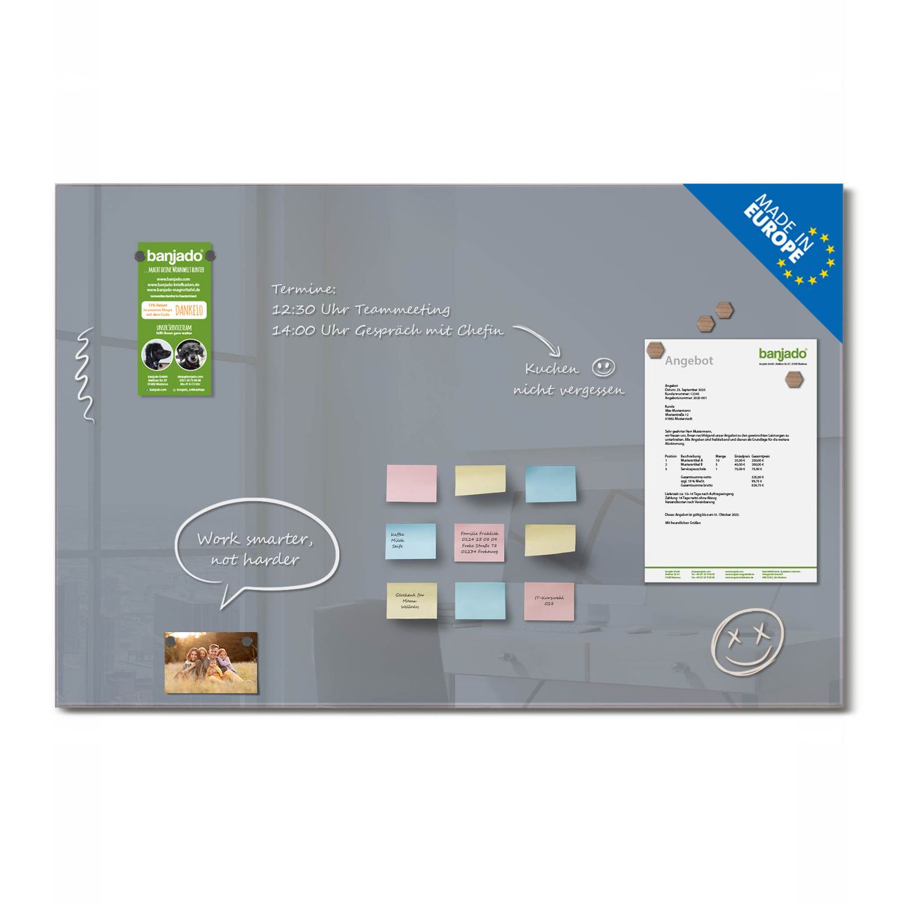 Jede Glas Magnettafel wird in unserer Werkstatt von Hand gefertigt und sorgfältig geprüft. So erhalten Sie ein echtes Qualitätsprodukt, das Funktion und Ästhetik perfekt vereint.?? Warum banjado?