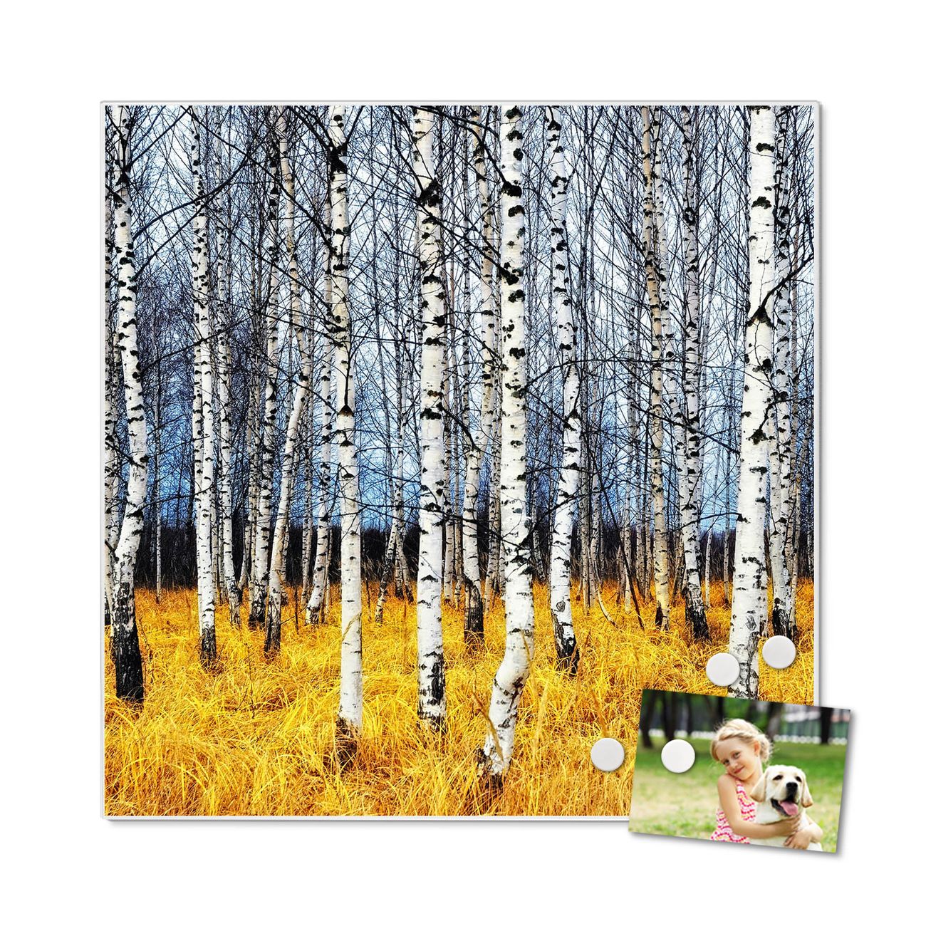 Die banjado Design Magnettafel mit Motiv Motiv Birkenhain bringt Ordnung in Ihr Zettelchaos. Fotos, Termine, Notizen oder Rezepte lassen Sich hier stilvoll mit Magneten ordnen, Sie behalten alles im Blick. An der Pinnwand halten alle handelsüblichen Magnete. Mit dieser Pinnwand aus Metall haben Sie auch ohne Notizen und Magnete ein schönes Dekoelement. Das Quadratische Format bietet Ihnen ausreichend Platz um alle wichtigen Informationen im Blick zu behalten.