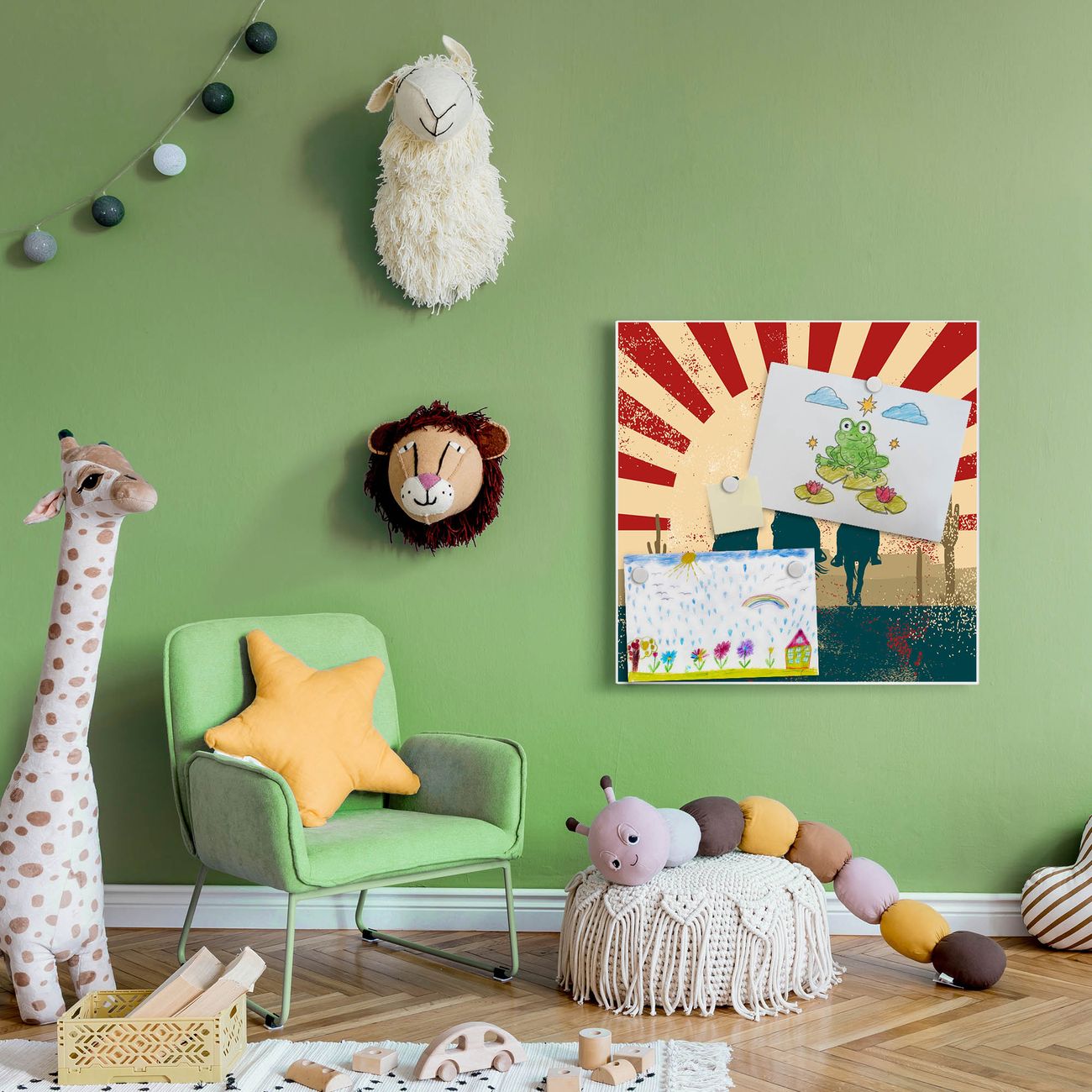 Die banjado Design Magnettafel mit Motiv Motiv Drei Cowboys bringt Ordnung in Ihr Zettelchaos. Fotos, Termine, Notizen oder Rezepte lassen Sich hier stilvoll mit Magneten ordnen, Sie behalten alles im Blick. An der Pinnwand halten alle handelsüblichen Magnete. Mit dieser Pinnwand aus Metall haben Sie auch ohne Notizen und Magnete ein schönes Dekoelement. Das Quadratische Format bietet Ihnen ausreichend Platz um alle wichtigen Informationen im Blick zu behalten.