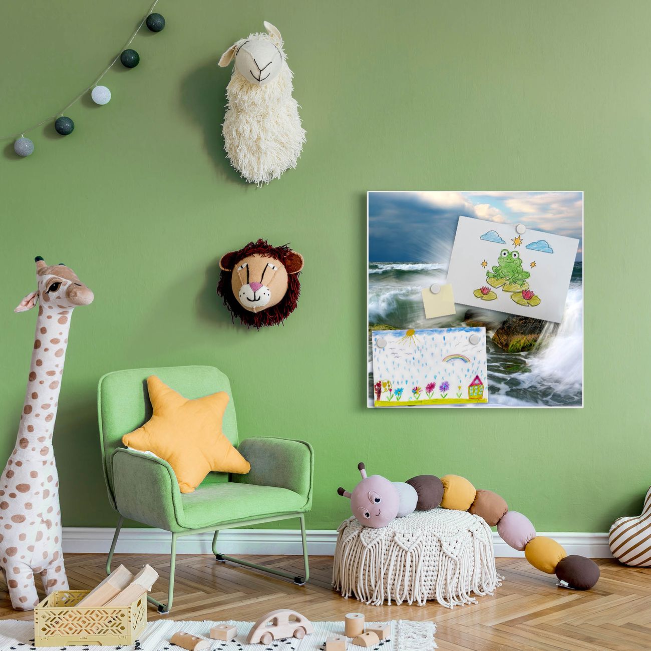 Die banjado Design Magnettafel mit Motiv Motiv Einsteinwelle bringt Ordnung in Ihr Zettelchaos. Fotos, Termine, Notizen oder Rezepte lassen Sich hier stilvoll mit Magneten ordnen, Sie behalten alles im Blick. An der Pinnwand halten alle handelsüblichen Magnete. Mit dieser Pinnwand aus Metall haben Sie auch ohne Notizen und Magnete ein schönes Dekoelement. Das Quadratische Format bietet Ihnen ausreichend Platz um alle wichtigen Informationen im Blick zu behalten.