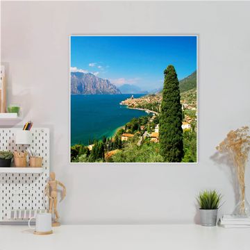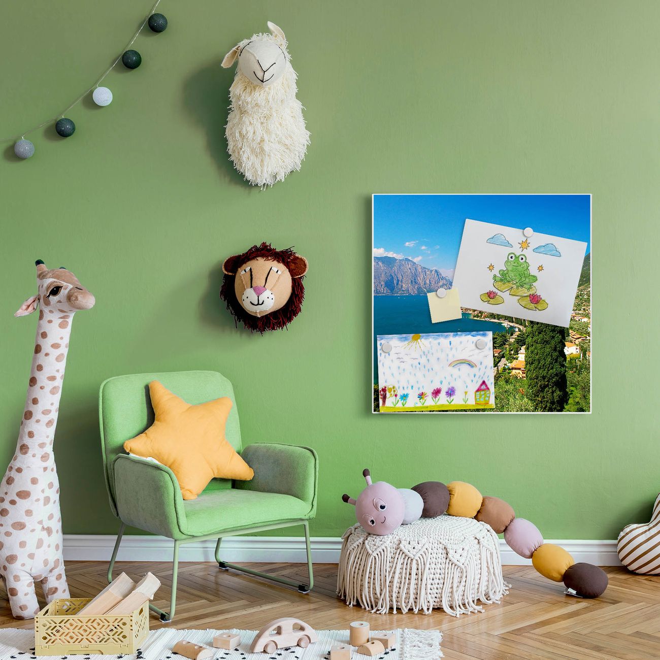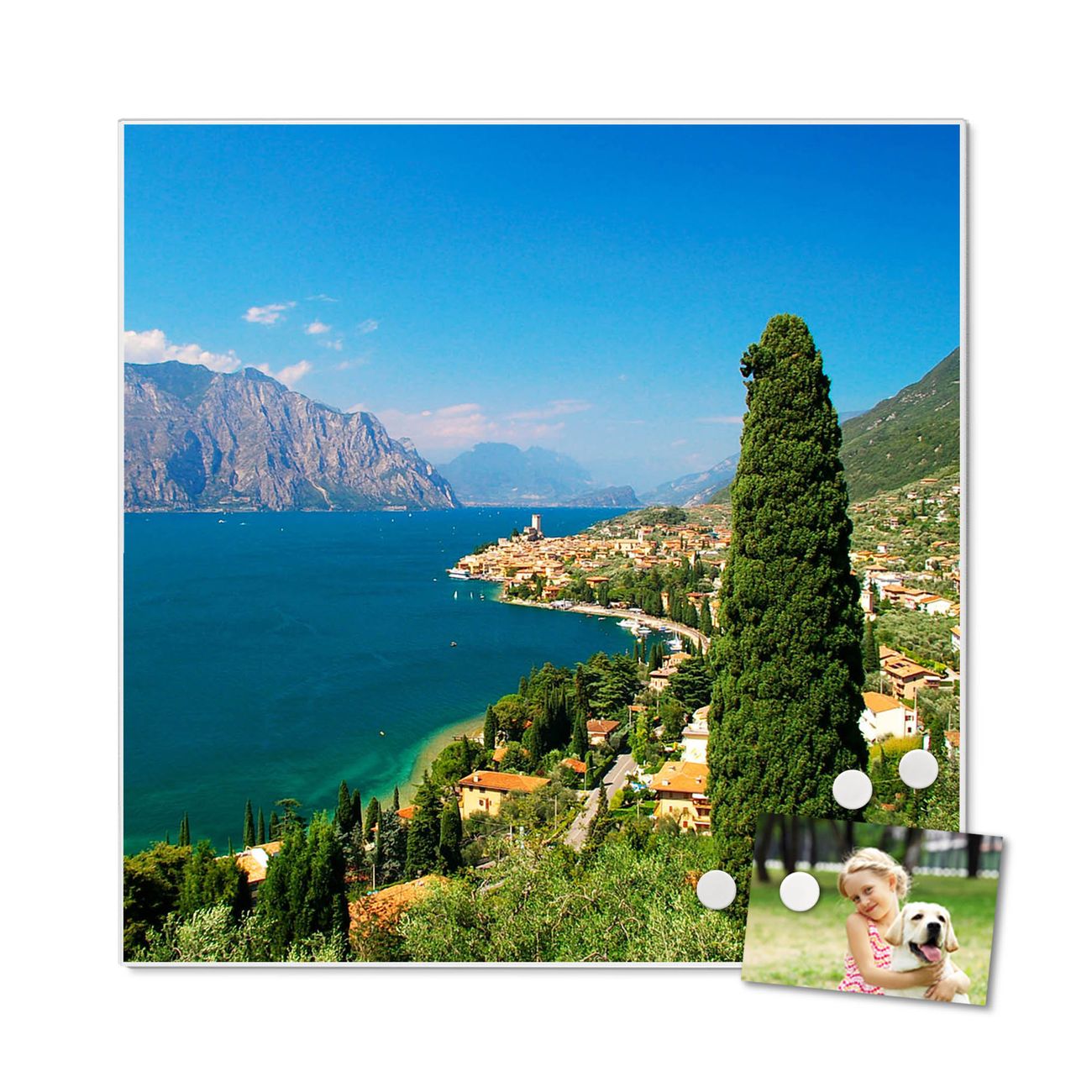 Die banjado Design Magnettafel mit Motiv Motiv Gardasee bringt Ordnung in Ihr Zettelchaos. Fotos, Termine, Notizen oder Rezepte lassen Sich hier stilvoll mit Magneten ordnen, Sie behalten alles im Blick. An der Pinnwand halten alle handelsüblichen Magnete. Mit dieser Pinnwand aus Metall haben Sie auch ohne Notizen und Magnete ein schönes Dekoelement. Das Quadratische Format bietet Ihnen ausreichend Platz um alle wichtigen Informationen im Blick zu behalten.