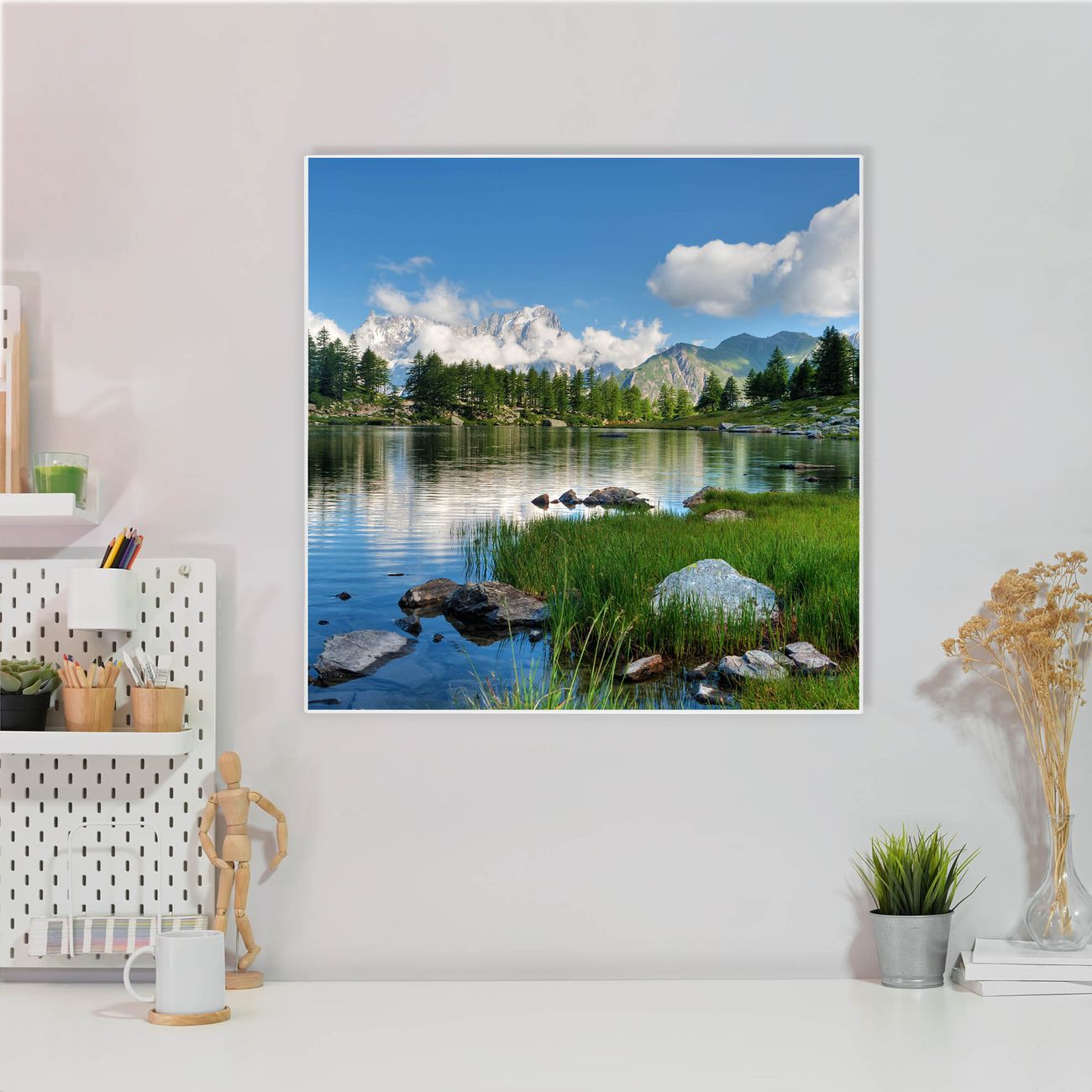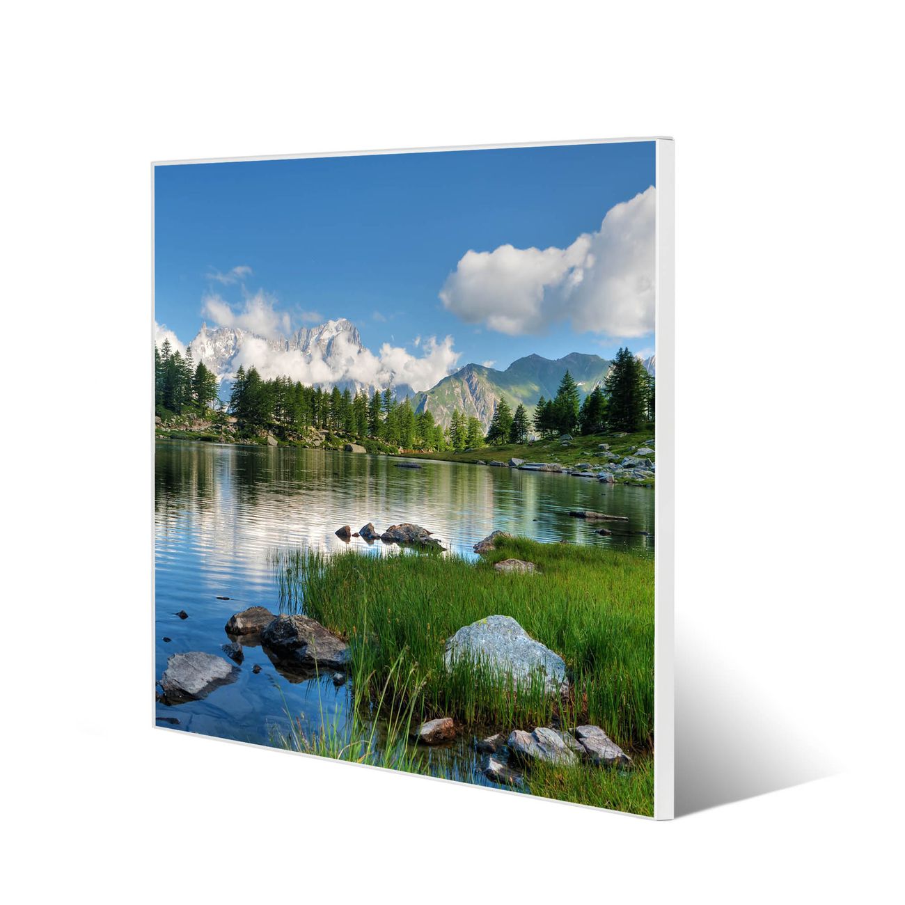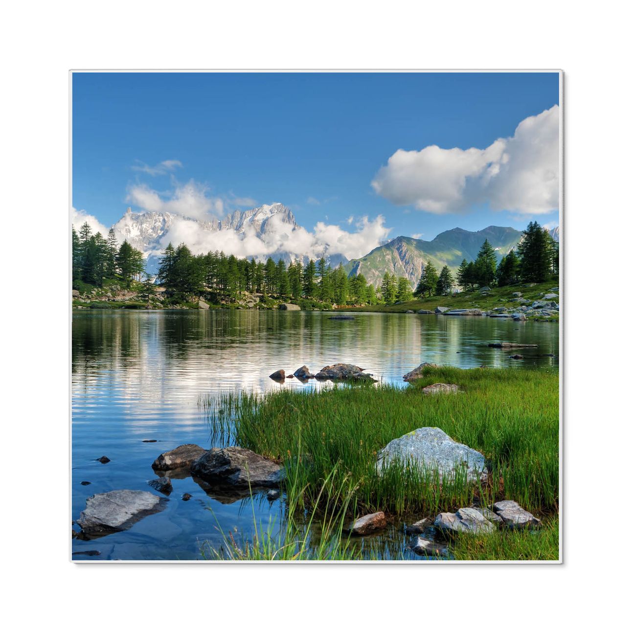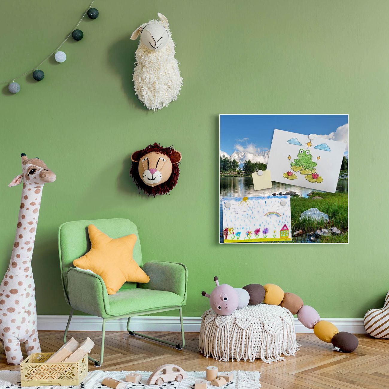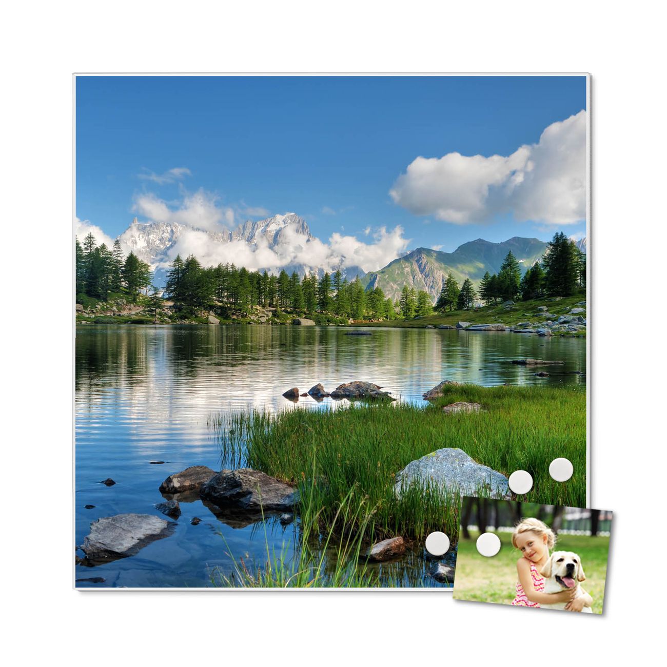Die banjado Design Magnettafel mit Motiv Motiv Gebirgssee bringt Ordnung in Ihr Zettelchaos. Fotos, Termine, Notizen oder Rezepte lassen Sich hier stilvoll mit Magneten ordnen, Sie behalten alles im Blick. An der Pinnwand halten alle handelsüblichen Magnete. Mit dieser Pinnwand aus Metall haben Sie auch ohne Notizen und Magnete ein schönes Dekoelement. Das Quadratische Format bietet Ihnen ausreichend Platz um alle wichtigen Informationen im Blick zu behalten.