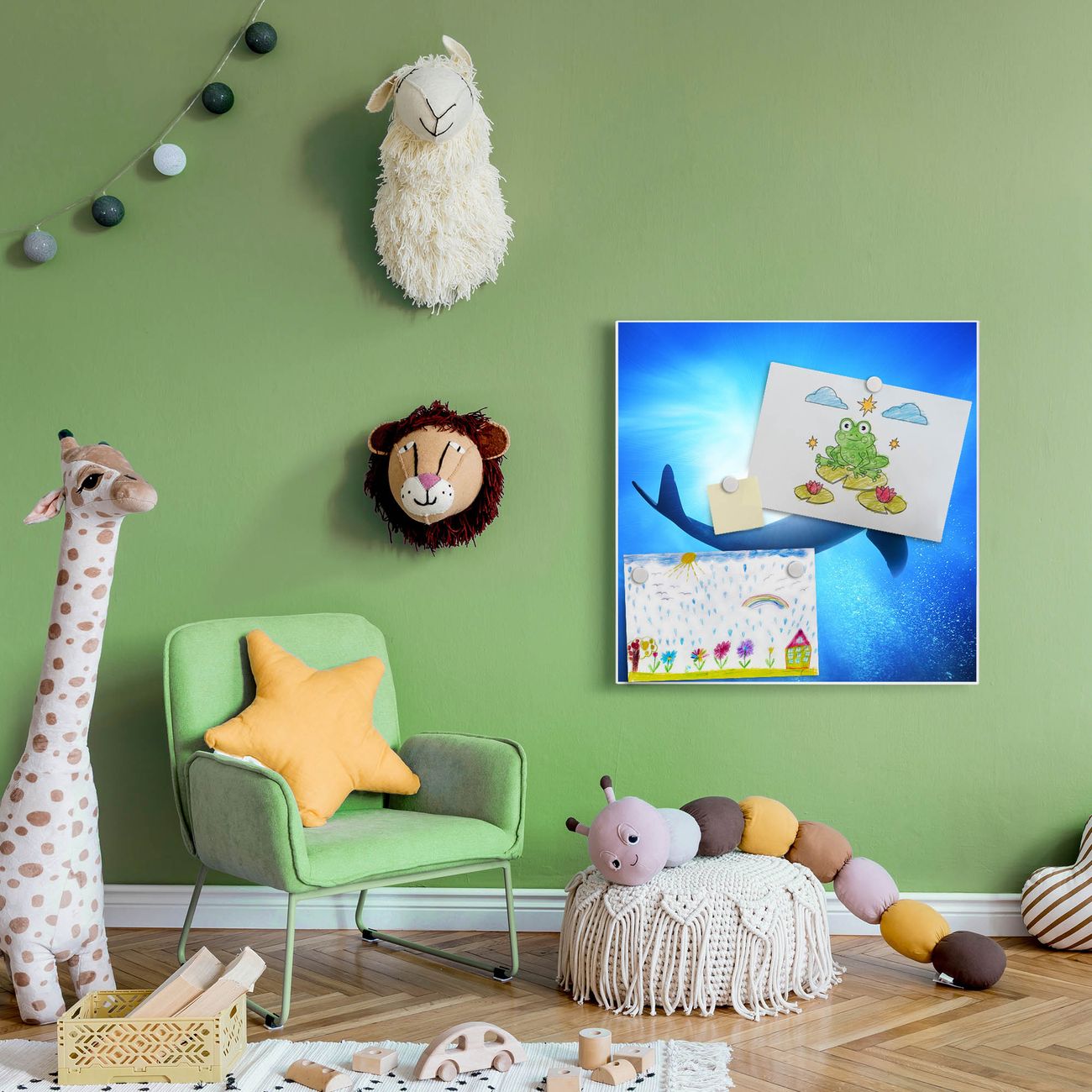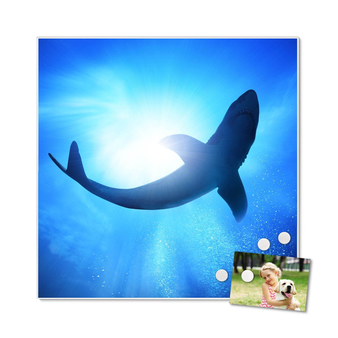 Die banjado Design Magnettafel mit Motiv Motiv Hai bringt Ordnung in Ihr Zettelchaos. Fotos, Termine, Notizen oder Rezepte lassen Sich hier stilvoll mit Magneten ordnen, Sie behalten alles im Blick. An der Pinnwand halten alle handelsüblichen Magnete. Mit dieser Pinnwand aus Metall haben Sie auch ohne Notizen und Magnete ein schönes Dekoelement. Das Quadratische Format bietet Ihnen ausreichend Platz um alle wichtigen Informationen im Blick zu behalten.