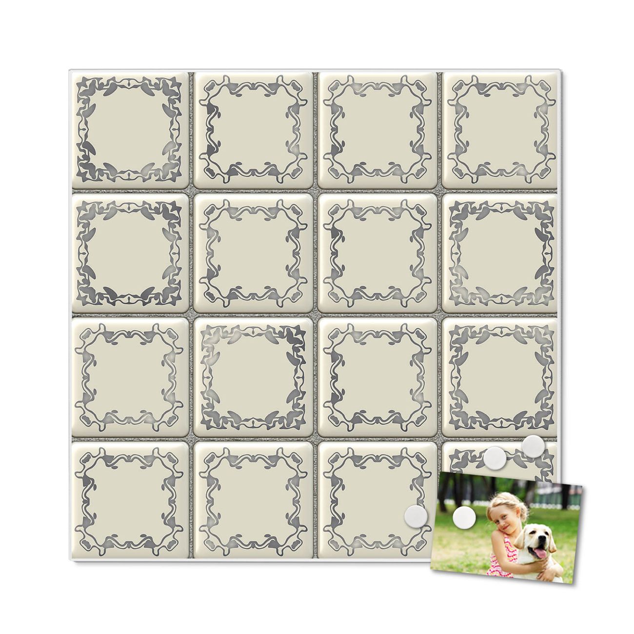 Die banjado Design Magnettafel mit Motiv Motiv Kacheln bringt Ordnung in Ihr Zettelchaos. Fotos, Termine, Notizen oder Rezepte lassen Sich hier stilvoll mit Magneten ordnen, Sie behalten alles im Blick. An der Pinnwand halten alle handelsüblichen Magnete. Mit dieser Pinnwand aus Metall haben Sie auch ohne Notizen und Magnete ein schönes Dekoelement. Das Quadratische Format bietet Ihnen ausreichend Platz um alle wichtigen Informationen im Blick zu behalten.