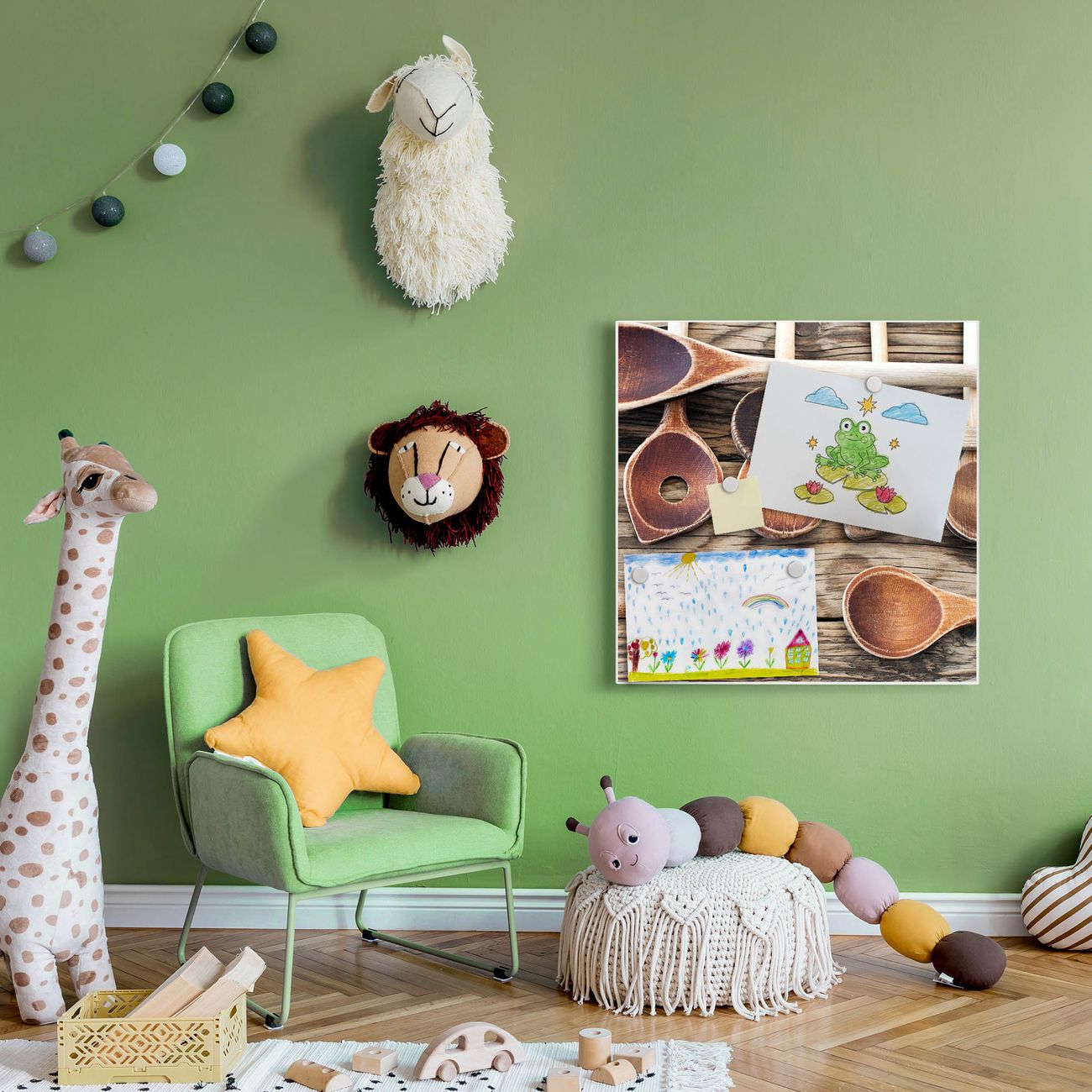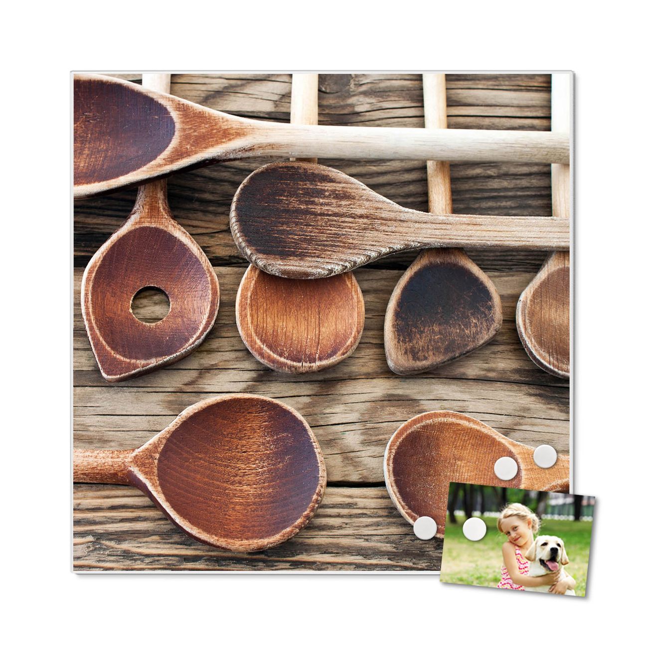 Die banjado Design Magnettafel mit Motiv Motiv Kochlöffel bringt Ordnung in Ihr Zettelchaos. Fotos, Termine, Notizen oder Rezepte lassen Sich hier stilvoll mit Magneten ordnen, Sie behalten alles im Blick. An der Pinnwand halten alle handelsüblichen Magnete. Mit dieser Pinnwand aus Metall haben Sie auch ohne Notizen und Magnete ein schönes Dekoelement. Das Quadratische Format bietet Ihnen ausreichend Platz um alle wichtigen Informationen im Blick zu behalten.