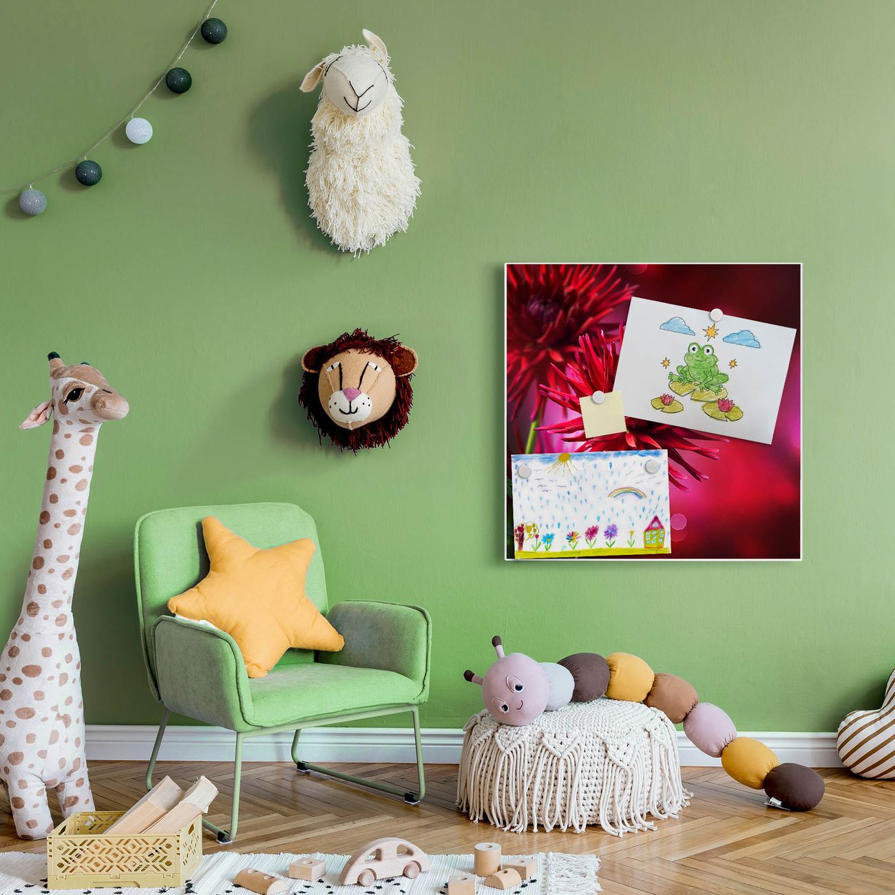 Die banjado Design Magnettafel mit Motiv Motiv Rote Dahlien bringt Ordnung in Ihr Zettelchaos. Fotos, Termine, Notizen oder Rezepte lassen Sich hier stilvoll mit Magneten ordnen, Sie behalten alles im Blick. An der Pinnwand halten alle handelsüblichen Magnete. Mit dieser Pinnwand aus Metall haben Sie auch ohne Notizen und Magnete ein schönes Dekoelement. Das Quadratische Format bietet Ihnen ausreichend Platz um alle wichtigen Informationen im Blick zu behalten.