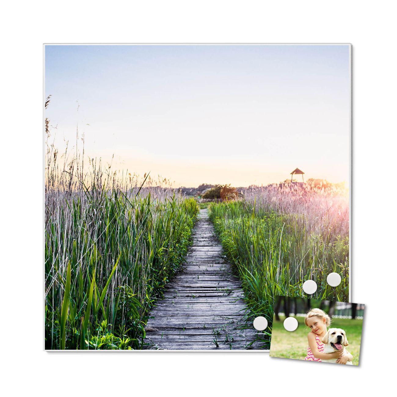 Die banjado Design Magnettafel mit Motiv Motiv Steg Durchs Schilf bringt Ordnung in Ihr Zettelchaos. Fotos, Termine, Notizen oder Rezepte lassen Sich hier stilvoll mit Magneten ordnen, Sie behalten alles im Blick. An der Pinnwand halten alle handelsüblichen Magnete. Mit dieser Pinnwand aus Metall haben Sie auch ohne Notizen und Magnete ein schönes Dekoelement. Das Quadratische Format bietet Ihnen ausreichend Platz um alle wichtigen Informationen im Blick zu behalten.
