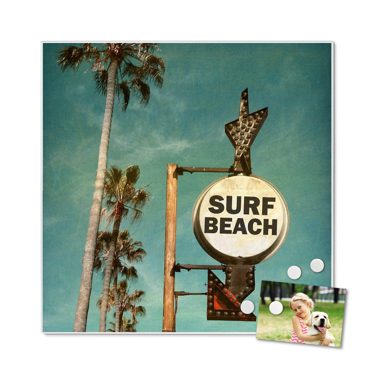 Die banjado Design Magnettafel mit Motiv Motiv Surf Beach bringt Ordnung in Ihr Zettelchaos. Fotos, Termine, Notizen oder Rezepte lassen Sich hier stilvoll mit Magneten ordnen, Sie behalten alles im Blick. An der Pinnwand halten alle handelsüblichen Magnete. Mit dieser Pinnwand aus Metall haben Sie auch ohne Notizen und Magnete ein schönes Dekoelement. Das Quadratische Format bietet Ihnen ausreichend Platz um alle wichtigen Informationen im Blick zu behalten.