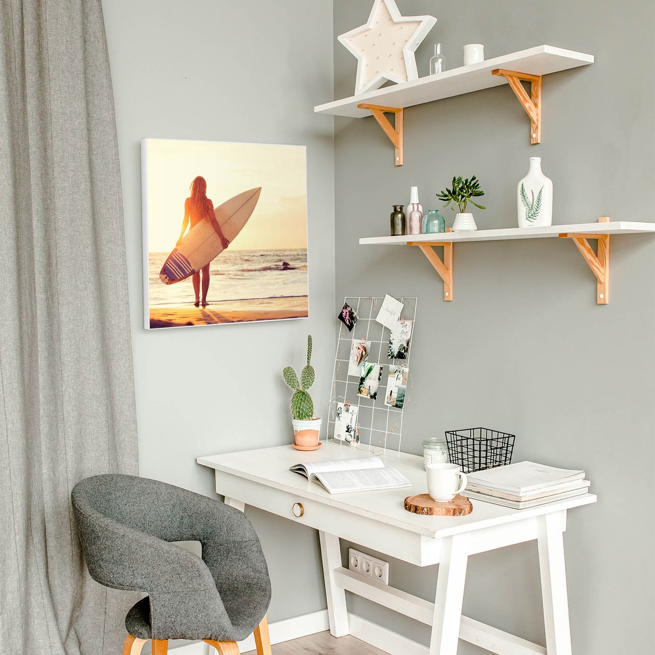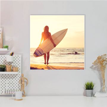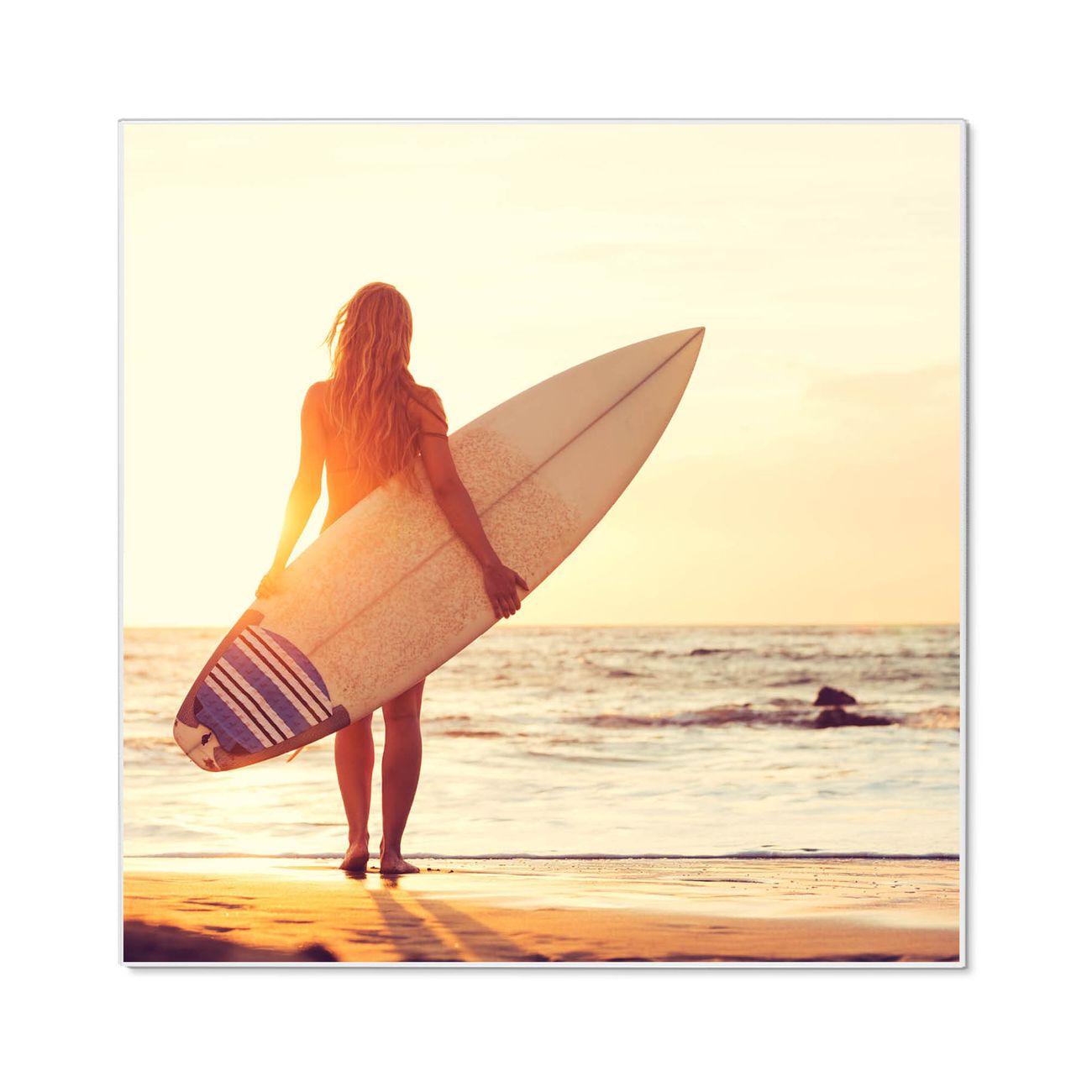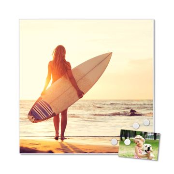 Die banjado Design Magnettafel mit Motiv Motiv Surfer Girl bringt Ordnung in Ihr Zettelchaos. Fotos, Termine, Notizen oder Rezepte lassen Sich hier stilvoll mit Magneten ordnen, Sie behalten alles im Blick. An der Pinnwand halten alle handelsüblichen Magnete. Mit dieser Pinnwand aus Metall haben Sie auch ohne Notizen und Magnete ein schönes Dekoelement. Das Quadratische Format bietet Ihnen ausreichend Platz um alle wichtigen Informationen im Blick zu behalten.
