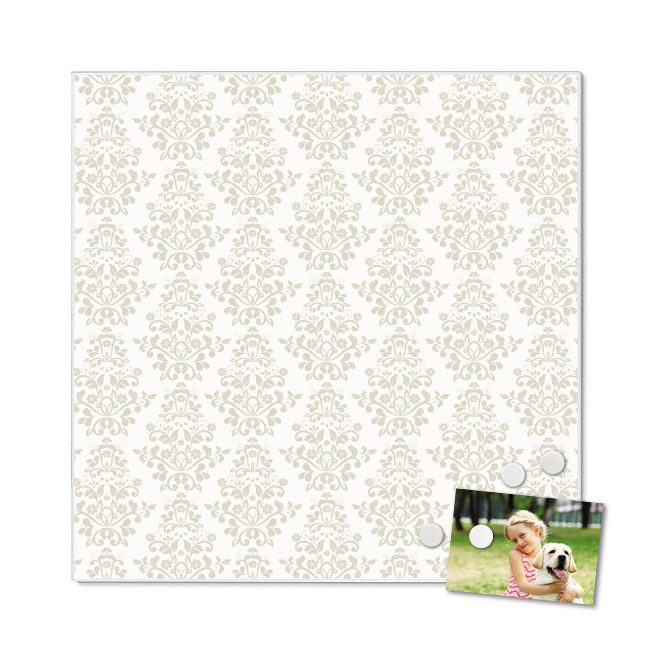 Die banjado Design Magnettafel mit Motiv Motiv Tapete Weiß bringt Ordnung in Ihr Zettelchaos. Fotos, Termine, Notizen oder Rezepte lassen Sich hier stilvoll mit Magneten ordnen, Sie behalten alles im Blick. An der Pinnwand halten alle handelsüblichen Magnete. Mit dieser Pinnwand aus Metall haben Sie auch ohne Notizen und Magnete ein schönes Dekoelement. Das Quadratische Format bietet Ihnen ausreichend Platz um alle wichtigen Informationen im Blick zu behalten.