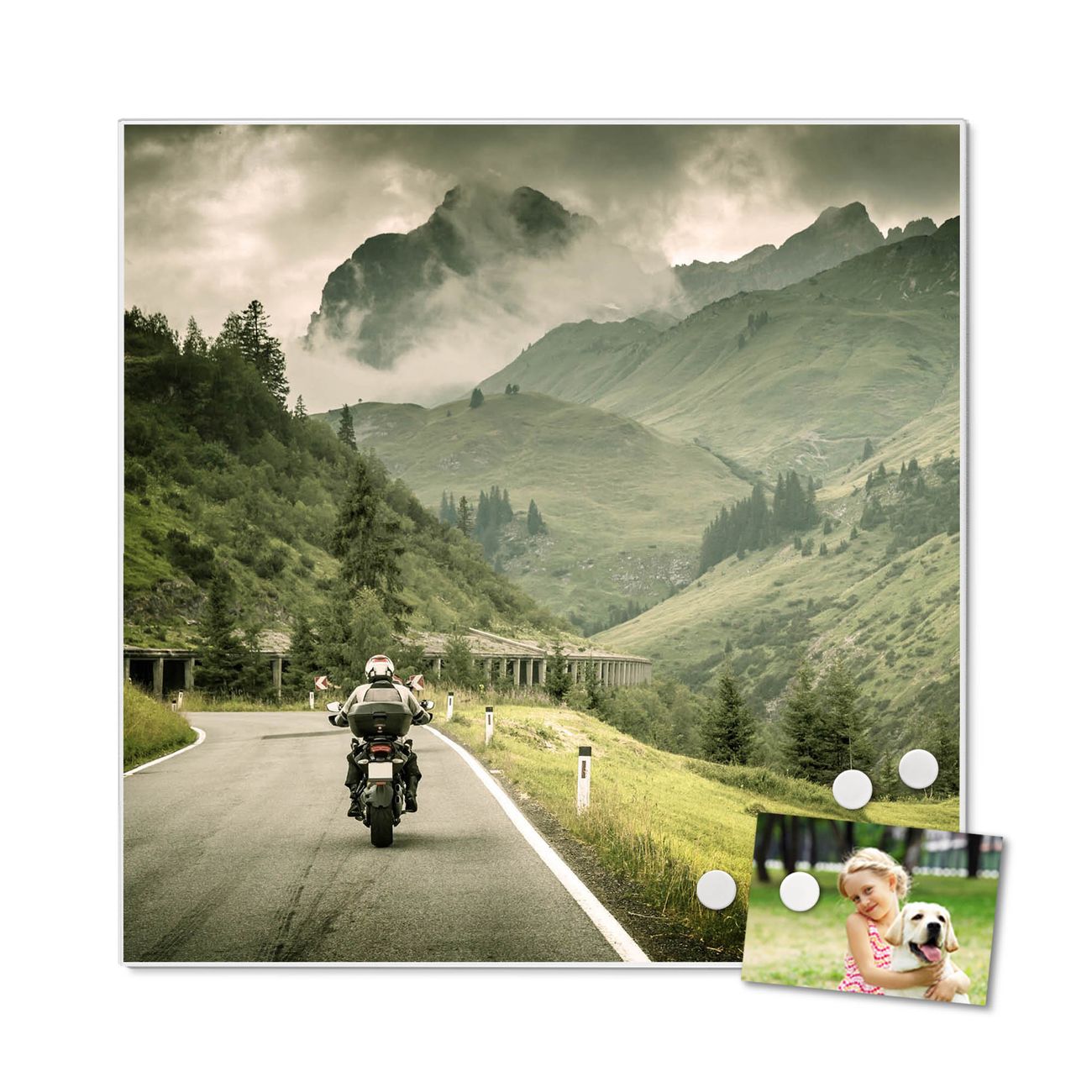 Die banjado Design Magnettafel mit Motiv Motiv Transalp bringt Ordnung in Ihr Zettelchaos. Fotos, Termine, Notizen oder Rezepte lassen Sich hier stilvoll mit Magneten ordnen, Sie behalten alles im Blick. An der Pinnwand halten alle handelsüblichen Magnete. Mit dieser Pinnwand aus Metall haben Sie auch ohne Notizen und Magnete ein schönes Dekoelement. Das Quadratische Format bietet Ihnen ausreichend Platz um alle wichtigen Informationen im Blick zu behalten.