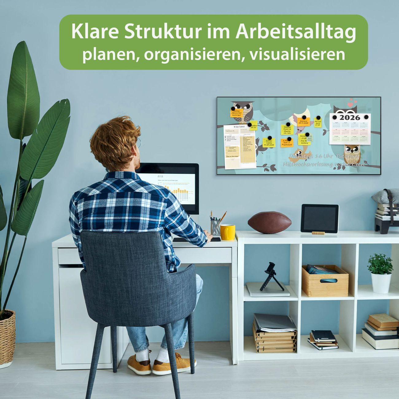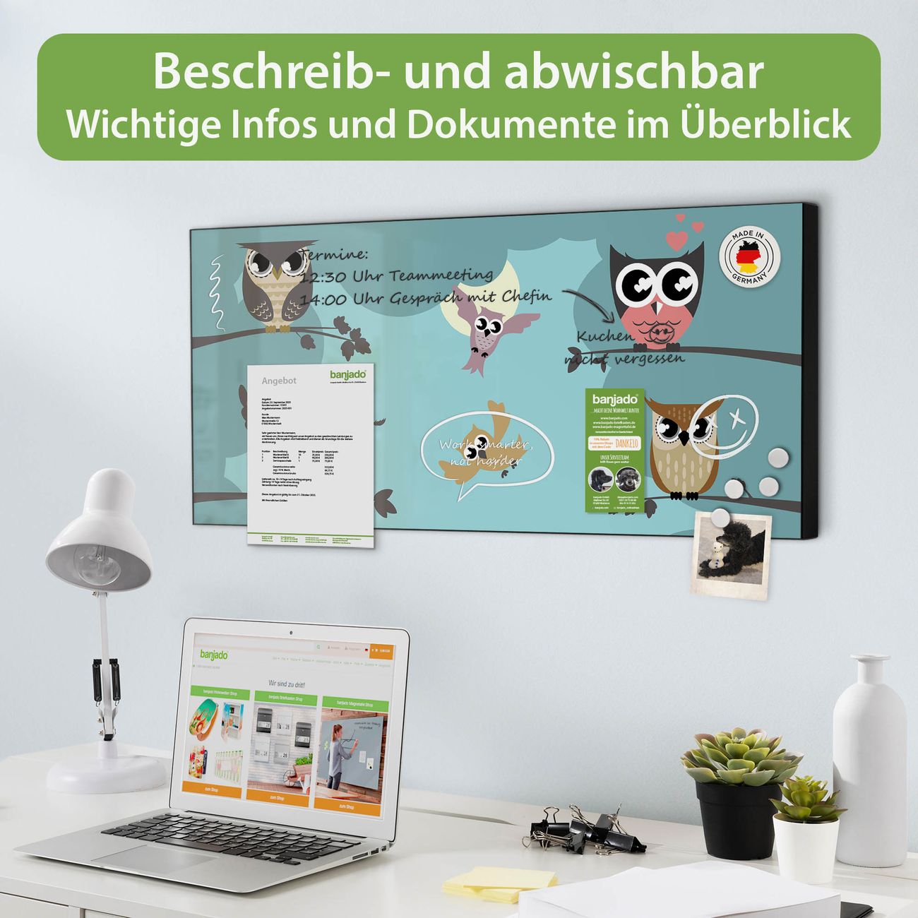 FUNKTION: Die banjado Magnettafel 78x37 cm im Design Motiv Acht Eulen vereint Funktionalität und modernes Wohndesign auf stilvolle Weise. Diese hochwertige Magnetwand aus Metall hilft Ihnen dabei, Notizen, Fotos, Termine, Einkaufslisten oder Rezepte übersichtlich zu organisieren. Als praktisches Memoboard sorgt sie für Struktur im Alltag und setzt gleichzeitig einen dekorativen Akzent an Ihrer Wand. DESIGN: Die Metalltafel besteht aus robustem, lackiertem Stahl und ist mit allen handelsüblichen Magneten nutzbar. Besonders praktisch ist die beschreibbare Oberfläche. Sie können die Magnettafel ganz einfach mit Kreidestiften beschriften und die Inhalte bei Bedarf mit einem feuchten Tuch wieder entfernen. So eignet sich das Memoboard ideal für Wochenpläne, Menüpläne, To Do Listen oder kreative Botschaften. DETAILS: Mit ihrem großzügigen Querformat von 78x37 cm bietet die Magnettafel ausreichend Platz für Ihre Organisation. Das Motiv Motiv Acht Eulen bringt eine warme, natürliche Optik in Küche, Flur, Büro oder Homeoffice und wirkt auch ohne Magnete oder Beschriftung wie ein modernes Wandbild. NUTZEN: Auf der Rückseite befinden sich vorgefertigte Löcher für eine schnelle und unkomplizierte Wandmontage. Jede banjado Magnettafel wird in Deutschland gefertigt und steht für Qualität, Langlebigkeit und liebevolle Verarbeitung. Dieses beschreibbare Memoboard ist die perfekte Kombination aus Metalltafel, Designobjekt und praktischer Magnetwand für Ihren Alltag. BANJADO: Wir sind ein kleines Team aus dem Herzen von Sachsen. Wir fertigen alle Artikel von Hand für Sie an, Sie erhalten keine preiswerte Importware. Auf Wunsch können Sie auch Ihr eigenes Foto auf die Magnettafel aufbringen, schreiben Sie uns an. Herzlichst, Ihr banjado-Team