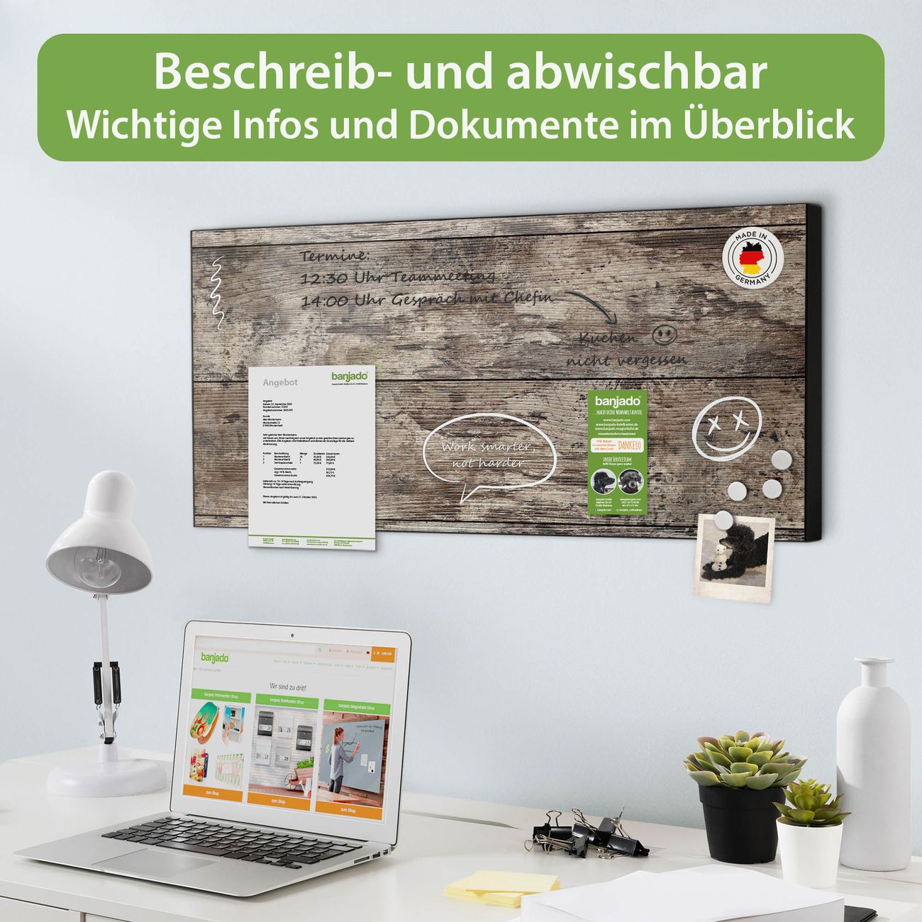 FUNKTION: Die banjado Magnettafel 78x37 cm im Design Motiv Alte Planken vereint Funktionalität und modernes Wohndesign auf stilvolle Weise. Diese hochwertige Magnetwand aus Metall hilft Ihnen dabei, Notizen, Fotos, Termine, Einkaufslisten oder Rezepte übersichtlich zu organisieren. Als praktisches Memoboard sorgt sie für Struktur im Alltag und setzt gleichzeitig einen dekorativen Akzent an Ihrer Wand. DESIGN: Die Metalltafel besteht aus robustem, lackiertem Stahl und ist mit allen handelsüblichen Magneten nutzbar. Besonders praktisch ist die beschreibbare Oberfläche. Sie können die Magnettafel ganz einfach mit Kreidestiften beschriften und die Inhalte bei Bedarf mit einem feuchten Tuch wieder entfernen. So eignet sich das Memoboard ideal für Wochenpläne, Menüpläne, To Do Listen oder kreative Botschaften. DETAILS: Mit ihrem großzügigen Querformat von 78x37 cm bietet die Magnettafel ausreichend Platz für Ihre Organisation. Das Motiv Motiv Alte Planken bringt eine warme, natürliche Optik in Küche, Flur, Büro oder Homeoffice und wirkt auch ohne Magnete oder Beschriftung wie ein modernes Wandbild. NUTZEN: Auf der Rückseite befinden sich vorgefertigte Löcher für eine schnelle und unkomplizierte Wandmontage. Jede banjado Magnettafel wird in Deutschland gefertigt und steht für Qualität, Langlebigkeit und liebevolle Verarbeitung. Dieses beschreibbare Memoboard ist die perfekte Kombination aus Metalltafel, Designobjekt und praktischer Magnetwand für Ihren Alltag. BANJADO: Wir sind ein kleines Team aus dem Herzen von Sachsen. Wir fertigen alle Artikel von Hand für Sie an, Sie erhalten keine preiswerte Importware. Auf Wunsch können Sie auch Ihr eigenes Foto auf die Magnettafel aufbringen, schreiben Sie uns an. Herzlichst, Ihr banjado-Team