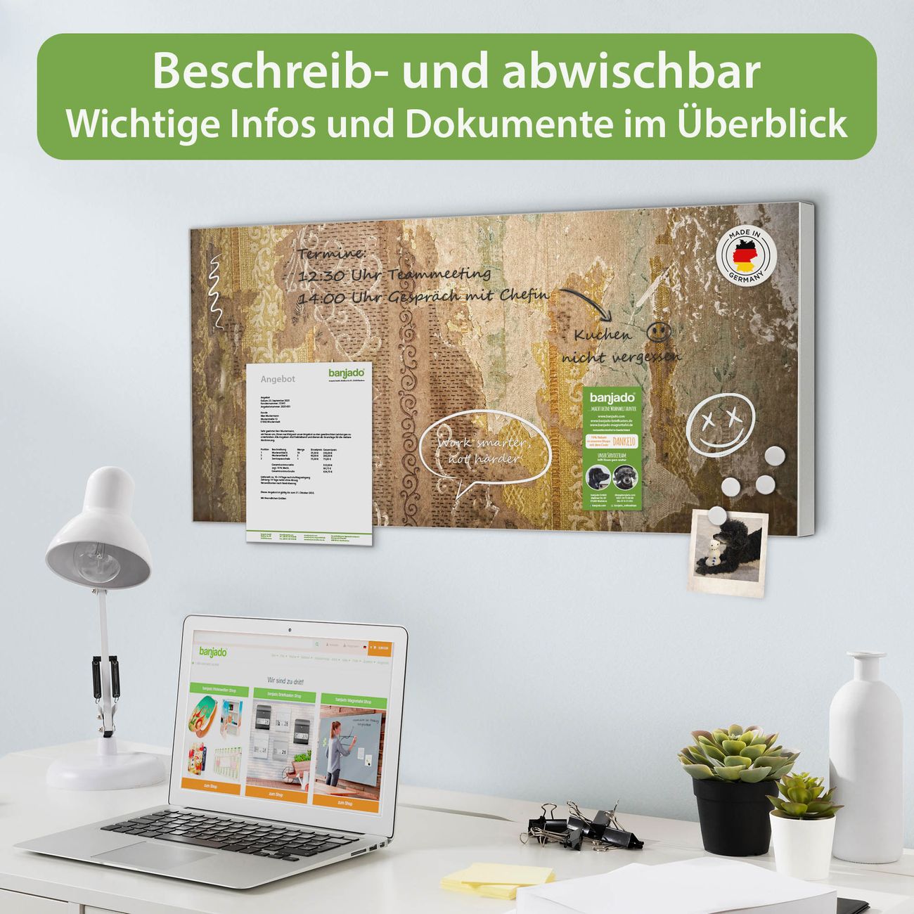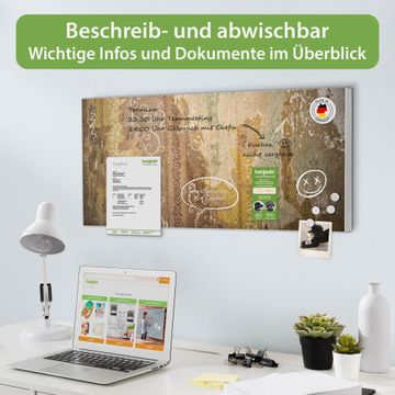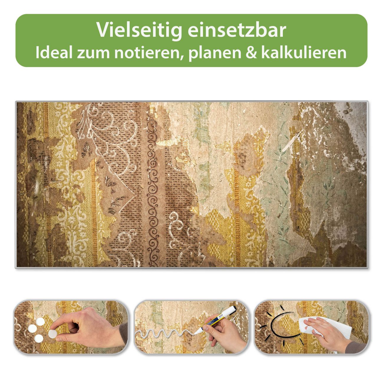 FUNKTION: Die banjado Magnettafel 78x37 cm im Design Motiv Alte Tapeten vereint Funktionalität und modernes Wohndesign auf stilvolle Weise. Diese hochwertige Magnetwand aus Metall hilft Ihnen dabei, Notizen, Fotos, Termine, Einkaufslisten oder Rezepte übersichtlich zu organisieren. Als praktisches Memoboard sorgt sie für Struktur im Alltag und setzt gleichzeitig einen dekorativen Akzent an Ihrer Wand. DESIGN: Die Metalltafel besteht aus robustem, lackiertem Stahl und ist mit allen handelsüblichen Magneten nutzbar. Besonders praktisch ist die beschreibbare Oberfläche. Sie können die Magnettafel ganz einfach mit Kreidestiften beschriften und die Inhalte bei Bedarf mit einem feuchten Tuch wieder entfernen. So eignet sich das Memoboard ideal für Wochenpläne, Menüpläne, To Do Listen oder kreative Botschaften. DETAILS: Mit ihrem großzügigen Querformat von 78x37 cm bietet die Magnettafel ausreichend Platz für Ihre Organisation. Das Motiv Motiv Alte Tapeten bringt eine warme, natürliche Optik in Küche, Flur, Büro oder Homeoffice und wirkt auch ohne Magnete oder Beschriftung wie ein modernes Wandbild. NUTZEN: Auf der Rückseite befinden sich vorgefertigte Löcher für eine schnelle und unkomplizierte Wandmontage. Jede banjado Magnettafel wird in Deutschland gefertigt und steht für Qualität, Langlebigkeit und liebevolle Verarbeitung. Dieses beschreibbare Memoboard ist die perfekte Kombination aus Metalltafel, Designobjekt und praktischer Magnetwand für Ihren Alltag. BANJADO: Wir sind ein kleines Team aus dem Herzen von Sachsen. Wir fertigen alle Artikel von Hand für Sie an, Sie erhalten keine preiswerte Importware. Auf Wunsch können Sie auch Ihr eigenes Foto auf die Magnettafel aufbringen, schreiben Sie uns an. Herzlichst, Ihr banjado-Team