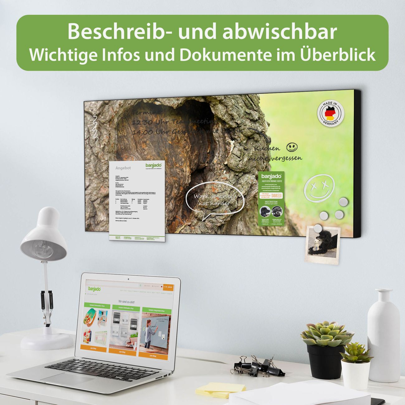 FUNKTION: Die banjado Magnettafel 78x37 cm im Design Motiv Altes Herz vereint Funktionalität und modernes Wohndesign auf stilvolle Weise. Diese hochwertige Magnetwand aus Metall hilft Ihnen dabei, Notizen, Fotos, Termine, Einkaufslisten oder Rezepte übersichtlich zu organisieren. Als praktisches Memoboard sorgt sie für Struktur im Alltag und setzt gleichzeitig einen dekorativen Akzent an Ihrer Wand. DESIGN: Die Metalltafel besteht aus robustem, lackiertem Stahl und ist mit allen handelsüblichen Magneten nutzbar. Besonders praktisch ist die beschreibbare Oberfläche. Sie können die Magnettafel ganz einfach mit Kreidestiften beschriften und die Inhalte bei Bedarf mit einem feuchten Tuch wieder entfernen. So eignet sich das Memoboard ideal für Wochenpläne, Menüpläne, To Do Listen oder kreative Botschaften. DETAILS: Mit ihrem großzügigen Querformat von 78x37 cm bietet die Magnettafel ausreichend Platz für Ihre Organisation. Das Motiv Motiv Altes Herz bringt eine warme, natürliche Optik in Küche, Flur, Büro oder Homeoffice und wirkt auch ohne Magnete oder Beschriftung wie ein modernes Wandbild. NUTZEN: Auf der Rückseite befinden sich vorgefertigte Löcher für eine schnelle und unkomplizierte Wandmontage. Jede banjado Magnettafel wird in Deutschland gefertigt und steht für Qualität, Langlebigkeit und liebevolle Verarbeitung. Dieses beschreibbare Memoboard ist die perfekte Kombination aus Metalltafel, Designobjekt und praktischer Magnetwand für Ihren Alltag. BANJADO: Wir sind ein kleines Team aus dem Herzen von Sachsen. Wir fertigen alle Artikel von Hand für Sie an, Sie erhalten keine preiswerte Importware. Auf Wunsch können Sie auch Ihr eigenes Foto auf die Magnettafel aufbringen, schreiben Sie uns an. Herzlichst, Ihr banjado-Team