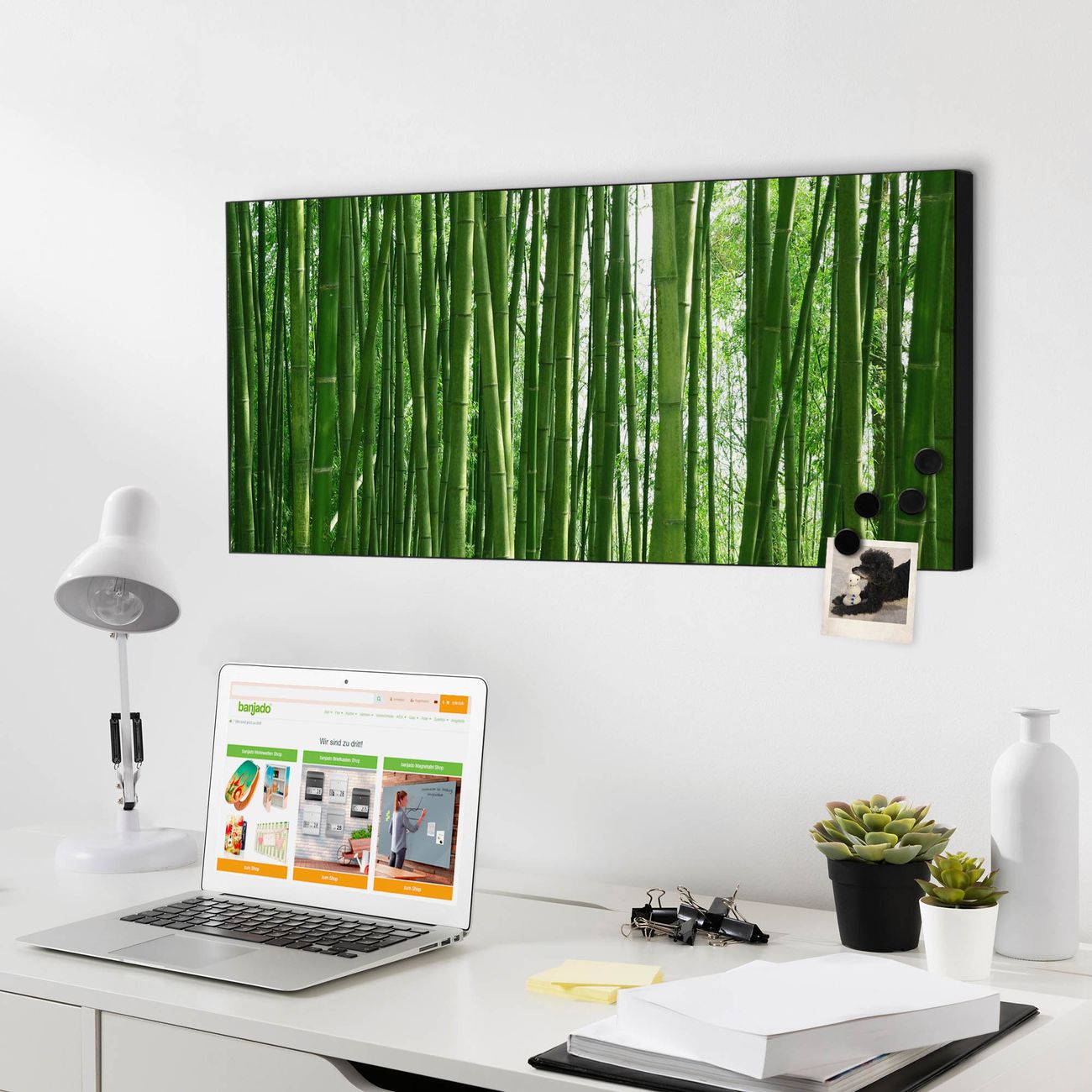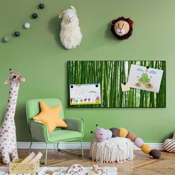 FUNKTION:  Die banjado Magnettafel mit Motiv Bambus Motiv bringt Ordnung in Ihr Zettelchaos. Fotos, Termine, Notizen oder Rezepte lassen Sich hier stilvoll mit Magneten ordnen, Sie behalten alles im Blick. An der Design Magnetwand halten alle handesüblichen Magnete. DESIGN:  Die Metall Pinnwand mit dem Motiv Motiv Bambus ist ein eleganter Begleiter im Alltag. Mit dieser Magnettafel haben Sie auch ohne Notizen und Magnete ein schönes Dekoelement. Das Format bietet Ihnen ausreichend Platz um alle wichtigen Informationen im Blick zu behalten. DETAILS: Die magnetische Pinnwand besteht aus silber-grau, weiß oder schwarz lackiertem Stahl. Sie hat eine Größe von 78cm x 37cm. Es befinden sich auf der Rückseite vorgefertigte Löcher die eine schnelle und unkomplizierte Anbringung ermöglichen. Das Motiv ist mit einem seidenmatten Laminat versehen und schützt so zusätzlich vor Kratzern. NUTZEN:  Sie können diese Magnettafel wunderbar als Wandbild nutzen, es halten alle handelsüblichen Magneten daran. Das Memoboard ist mit einem feuchten Lappen oder Schwamm abwischbar. Sie finden bei uns eine große Auswahl an passenden Magneten. BANJADO:  Wir sind ein kleines Team aus dem Herzen von Sachsen. Wir fertigen alle Artikel von Hand für Sie an, Sie erhalten keine preiswerte Importware. Auf Wunsch können Sie auch Ihr eigenes Foto auf die Magnettafel aufbringen, schreiben Sie uns an. Herzlichst, Ihr banjado-Team