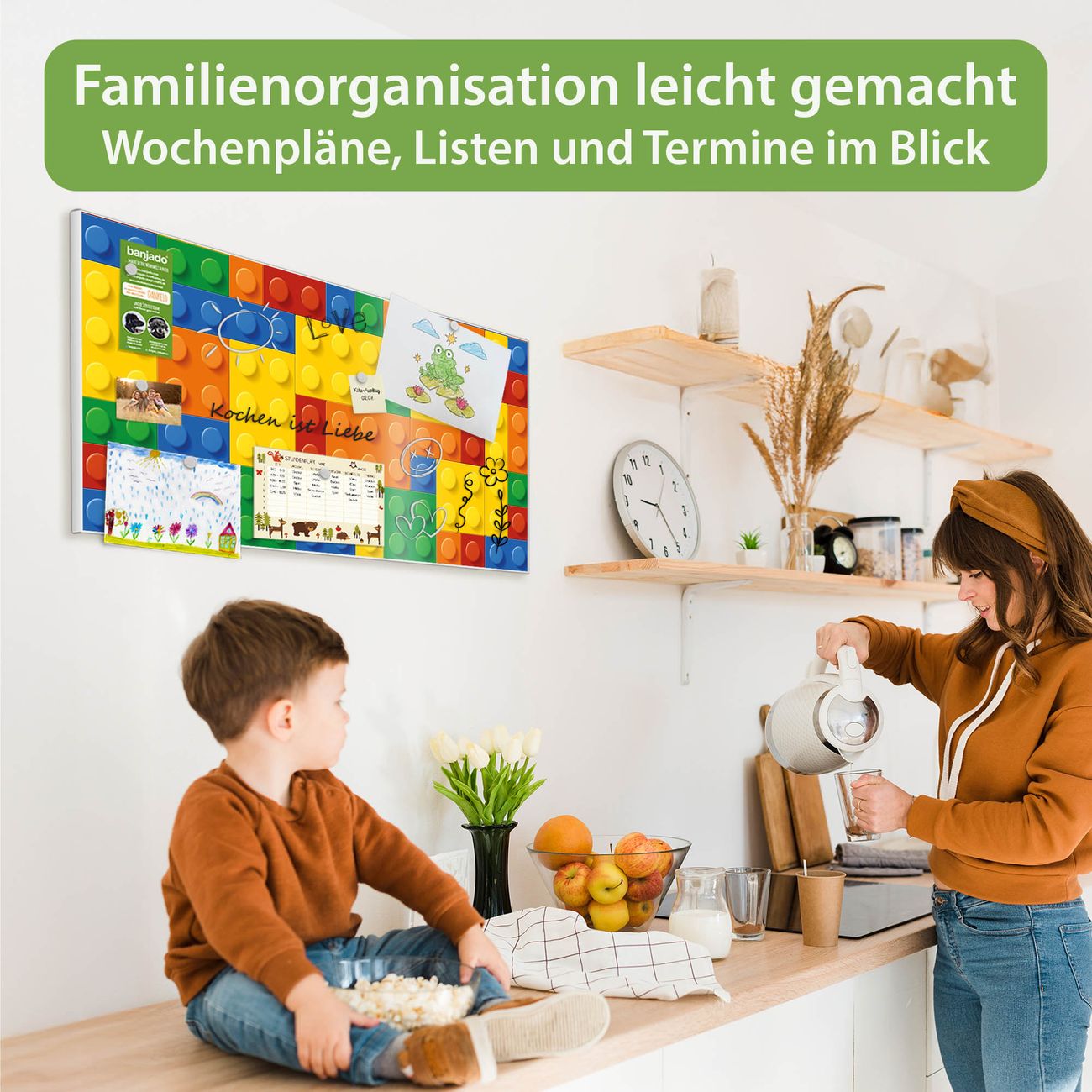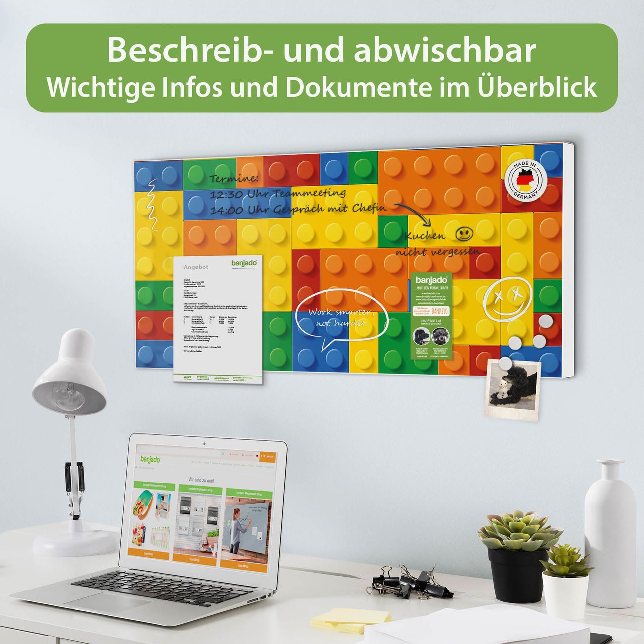 FUNKTION: Die banjado Magnettafel 78x37 cm im Design Motiv Bausteine vereint Funktionalität und modernes Wohndesign auf stilvolle Weise. Diese hochwertige Magnetwand aus Metall hilft Ihnen dabei, Notizen, Fotos, Termine, Einkaufslisten oder Rezepte übersichtlich zu organisieren. Als praktisches Memoboard sorgt sie für Struktur im Alltag und setzt gleichzeitig einen dekorativen Akzent an Ihrer Wand. DESIGN: Die Metalltafel besteht aus robustem, lackiertem Stahl und ist mit allen handelsüblichen Magneten nutzbar. Besonders praktisch ist die beschreibbare Oberfläche. Sie können die Magnettafel ganz einfach mit Kreidestiften beschriften und die Inhalte bei Bedarf mit einem feuchten Tuch wieder entfernen. So eignet sich das Memoboard ideal für Wochenpläne, Menüpläne, To Do Listen oder kreative Botschaften. DETAILS: Mit ihrem großzügigen Querformat von 78x37 cm bietet die Magnettafel ausreichend Platz für Ihre Organisation. Das Motiv Motiv Bausteine bringt eine warme, natürliche Optik in Küche, Flur, Büro oder Homeoffice und wirkt auch ohne Magnete oder Beschriftung wie ein modernes Wandbild. NUTZEN: Auf der Rückseite befinden sich vorgefertigte Löcher für eine schnelle und unkomplizierte Wandmontage. Jede banjado Magnettafel wird in Deutschland gefertigt und steht für Qualität, Langlebigkeit und liebevolle Verarbeitung. Dieses beschreibbare Memoboard ist die perfekte Kombination aus Metalltafel, Designobjekt und praktischer Magnetwand für Ihren Alltag. BANJADO: Wir sind ein kleines Team aus dem Herzen von Sachsen. Wir fertigen alle Artikel von Hand für Sie an, Sie erhalten keine preiswerte Importware. Auf Wunsch können Sie auch Ihr eigenes Foto auf die Magnettafel aufbringen, schreiben Sie uns an. Herzlichst, Ihr banjado-Team