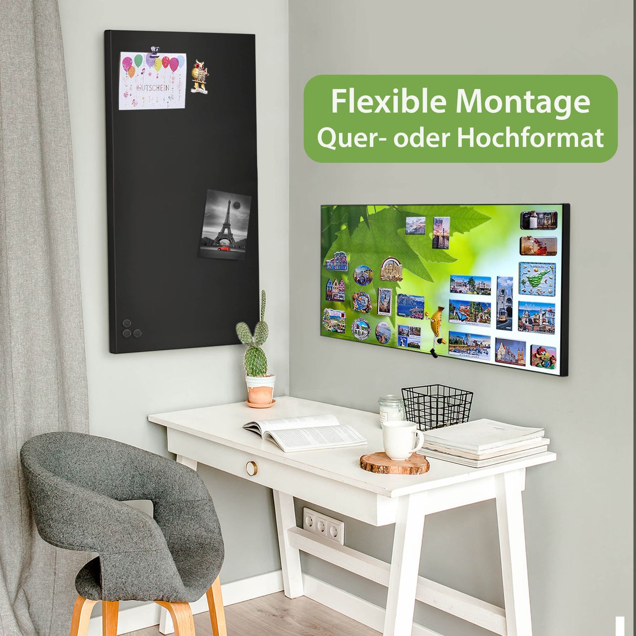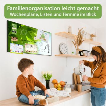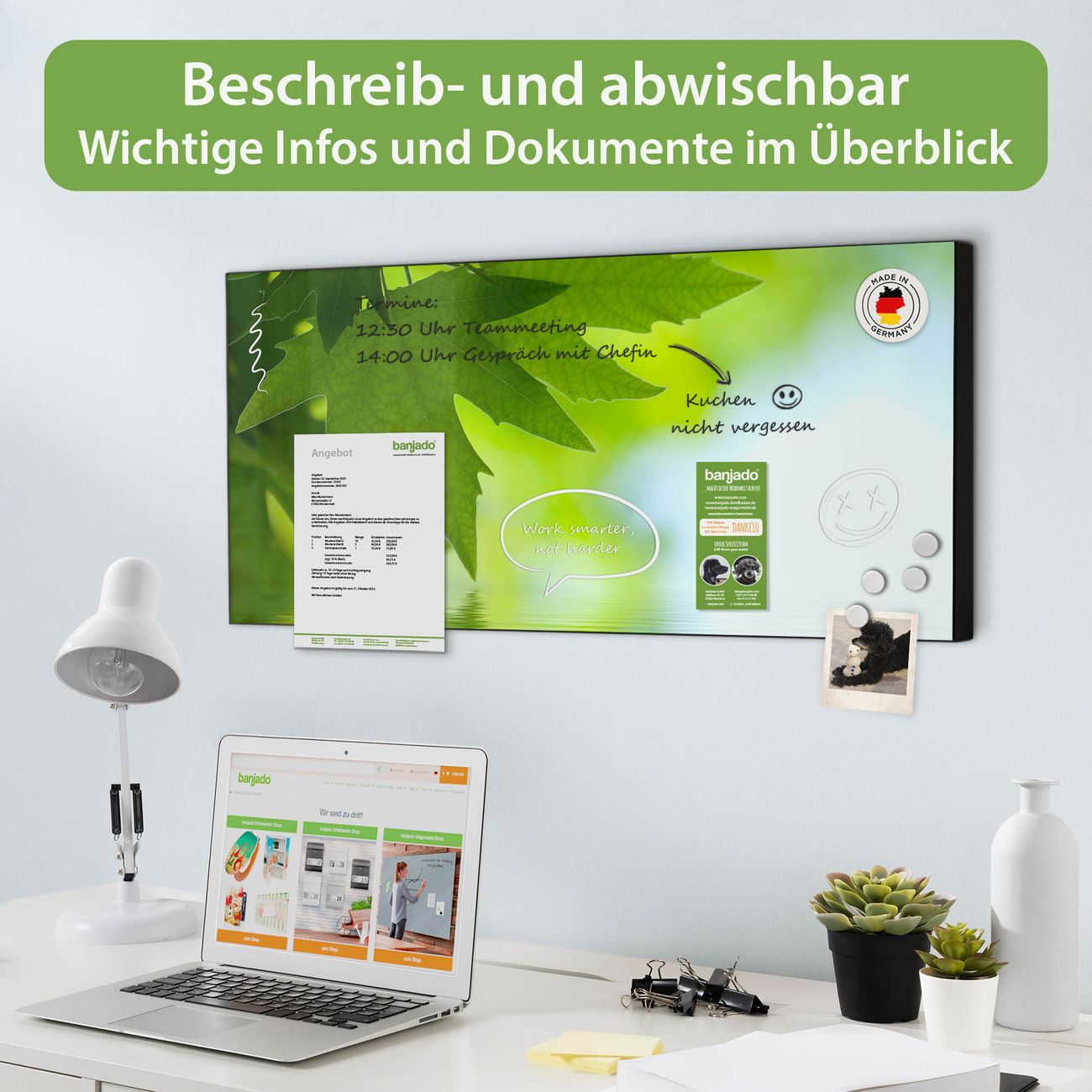 FUNKTION: Die banjado Magnettafel 78x37 cm im Design Motiv Blättertraum vereint Funktionalität und modernes Wohndesign auf stilvolle Weise. Diese hochwertige Magnetwand aus Metall hilft Ihnen dabei, Notizen, Fotos, Termine, Einkaufslisten oder Rezepte übersichtlich zu organisieren. Als praktisches Memoboard sorgt sie für Struktur im Alltag und setzt gleichzeitig einen dekorativen Akzent an Ihrer Wand. DESIGN: Die Metalltafel besteht aus robustem, lackiertem Stahl und ist mit allen handelsüblichen Magneten nutzbar. Besonders praktisch ist die beschreibbare Oberfläche. Sie können die Magnettafel ganz einfach mit Kreidestiften beschriften und die Inhalte bei Bedarf mit einem feuchten Tuch wieder entfernen. So eignet sich das Memoboard ideal für Wochenpläne, Menüpläne, To Do Listen oder kreative Botschaften. DETAILS: Mit ihrem großzügigen Querformat von 78x37 cm bietet die Magnettafel ausreichend Platz für Ihre Organisation. Das Motiv Motiv Blättertraum bringt eine warme, natürliche Optik in Küche, Flur, Büro oder Homeoffice und wirkt auch ohne Magnete oder Beschriftung wie ein modernes Wandbild. NUTZEN: Auf der Rückseite befinden sich vorgefertigte Löcher für eine schnelle und unkomplizierte Wandmontage. Jede banjado Magnettafel wird in Deutschland gefertigt und steht für Qualität, Langlebigkeit und liebevolle Verarbeitung. Dieses beschreibbare Memoboard ist die perfekte Kombination aus Metalltafel, Designobjekt und praktischer Magnetwand für Ihren Alltag. BANJADO: Wir sind ein kleines Team aus dem Herzen von Sachsen. Wir fertigen alle Artikel von Hand für Sie an, Sie erhalten keine preiswerte Importware. Auf Wunsch können Sie auch Ihr eigenes Foto auf die Magnettafel aufbringen, schreiben Sie uns an. Herzlichst, Ihr banjado-Team