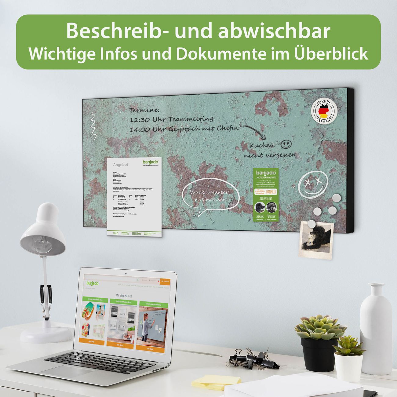 FUNKTION: Die banjado Magnettafel 78x37 cm im Design Motiv Blaue Struktur vereint Funktionalität und modernes Wohndesign auf stilvolle Weise. Diese hochwertige Magnetwand aus Metall hilft Ihnen dabei, Notizen, Fotos, Termine, Einkaufslisten oder Rezepte übersichtlich zu organisieren. Als praktisches Memoboard sorgt sie für Struktur im Alltag und setzt gleichzeitig einen dekorativen Akzent an Ihrer Wand. DESIGN: Die Metalltafel besteht aus robustem, lackiertem Stahl und ist mit allen handelsüblichen Magneten nutzbar. Besonders praktisch ist die beschreibbare Oberfläche. Sie können die Magnettafel ganz einfach mit Kreidestiften beschriften und die Inhalte bei Bedarf mit einem feuchten Tuch wieder entfernen. So eignet sich das Memoboard ideal für Wochenpläne, Menüpläne, To Do Listen oder kreative Botschaften. DETAILS: Mit ihrem großzügigen Querformat von 78x37 cm bietet die Magnettafel ausreichend Platz für Ihre Organisation. Das Motiv Motiv Blaue Struktur bringt eine warme, natürliche Optik in Küche, Flur, Büro oder Homeoffice und wirkt auch ohne Magnete oder Beschriftung wie ein modernes Wandbild. NUTZEN: Auf der Rückseite befinden sich vorgefertigte Löcher für eine schnelle und unkomplizierte Wandmontage. Jede banjado Magnettafel wird in Deutschland gefertigt und steht für Qualität, Langlebigkeit und liebevolle Verarbeitung. Dieses beschreibbare Memoboard ist die perfekte Kombination aus Metalltafel, Designobjekt und praktischer Magnetwand für Ihren Alltag. BANJADO: Wir sind ein kleines Team aus dem Herzen von Sachsen. Wir fertigen alle Artikel von Hand für Sie an, Sie erhalten keine preiswerte Importware. Auf Wunsch können Sie auch Ihr eigenes Foto auf die Magnettafel aufbringen, schreiben Sie uns an. Herzlichst, Ihr banjado-Team