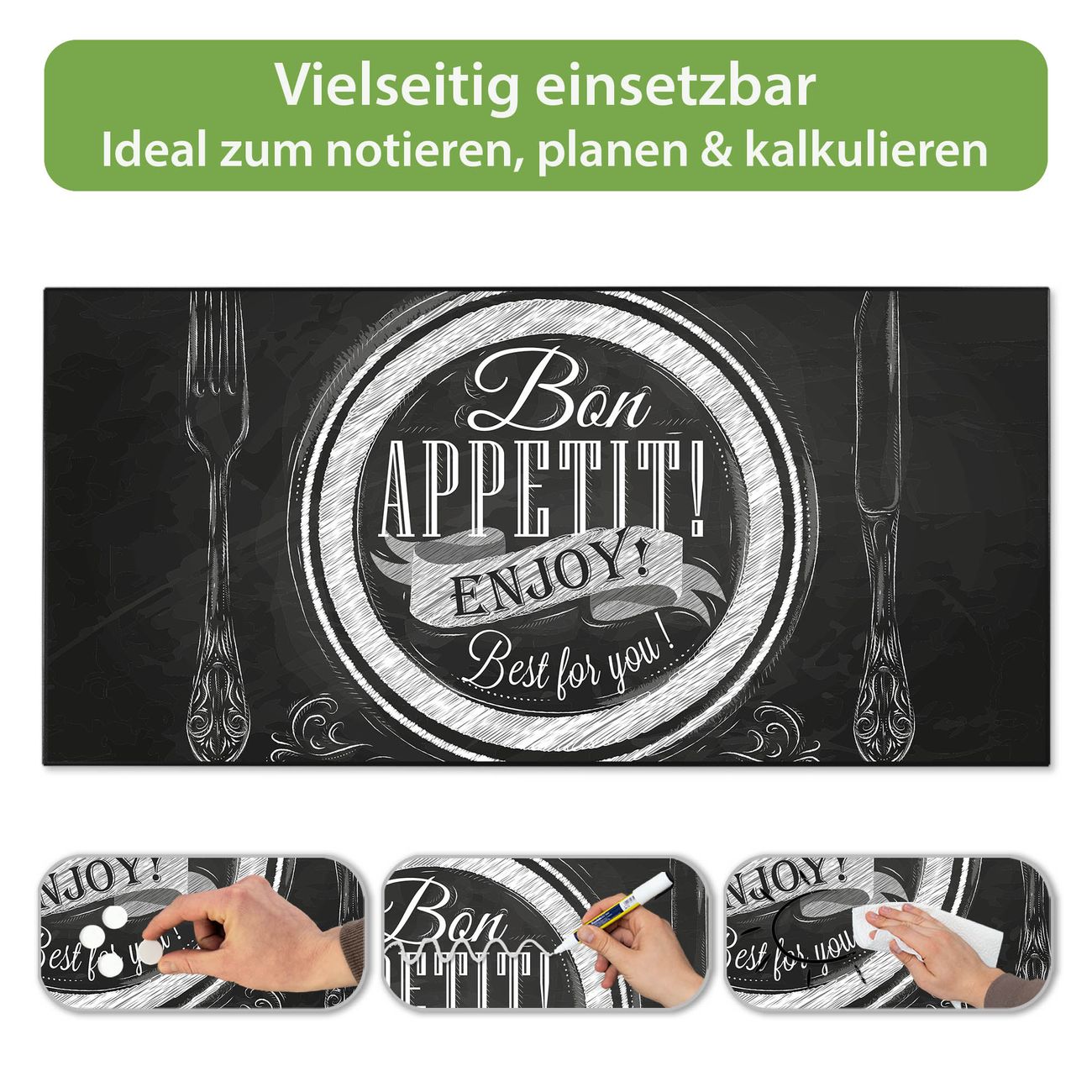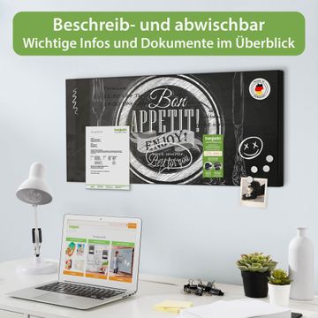 FUNKTION: Die banjado Magnettafel 78x37 cm im Design Motiv Bon Appetit vereint Funktionalität und modernes Wohndesign auf stilvolle Weise. Diese hochwertige Magnetwand aus Metall hilft Ihnen dabei, Notizen, Fotos, Termine, Einkaufslisten oder Rezepte übersichtlich zu organisieren. Als praktisches Memoboard sorgt sie für Struktur im Alltag und setzt gleichzeitig einen dekorativen Akzent an Ihrer Wand. DESIGN: Die Metalltafel besteht aus robustem, lackiertem Stahl und ist mit allen handelsüblichen Magneten nutzbar. Besonders praktisch ist die beschreibbare Oberfläche. Sie können die Magnettafel ganz einfach mit Kreidestiften beschriften und die Inhalte bei Bedarf mit einem feuchten Tuch wieder entfernen. So eignet sich das Memoboard ideal für Wochenpläne, Menüpläne, To Do Listen oder kreative Botschaften. DETAILS: Mit ihrem großzügigen Querformat von 78x37 cm bietet die Magnettafel ausreichend Platz für Ihre Organisation. Das Motiv Motiv Bon Appetit bringt eine warme, natürliche Optik in Küche, Flur, Büro oder Homeoffice und wirkt auch ohne Magnete oder Beschriftung wie ein modernes Wandbild. NUTZEN: Auf der Rückseite befinden sich vorgefertigte Löcher für eine schnelle und unkomplizierte Wandmontage. Jede banjado Magnettafel wird in Deutschland gefertigt und steht für Qualität, Langlebigkeit und liebevolle Verarbeitung. Dieses beschreibbare Memoboard ist die perfekte Kombination aus Metalltafel, Designobjekt und praktischer Magnetwand für Ihren Alltag. BANJADO: Wir sind ein kleines Team aus dem Herzen von Sachsen. Wir fertigen alle Artikel von Hand für Sie an, Sie erhalten keine preiswerte Importware. Auf Wunsch können Sie auch Ihr eigenes Foto auf die Magnettafel aufbringen, schreiben Sie uns an. Herzlichst, Ihr banjado-Team